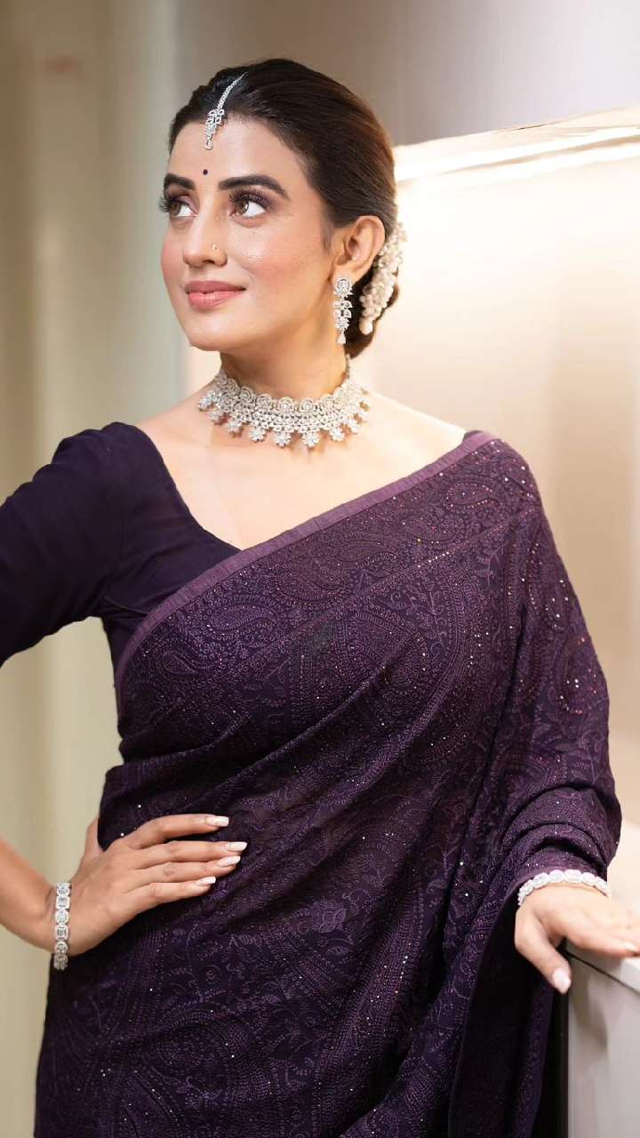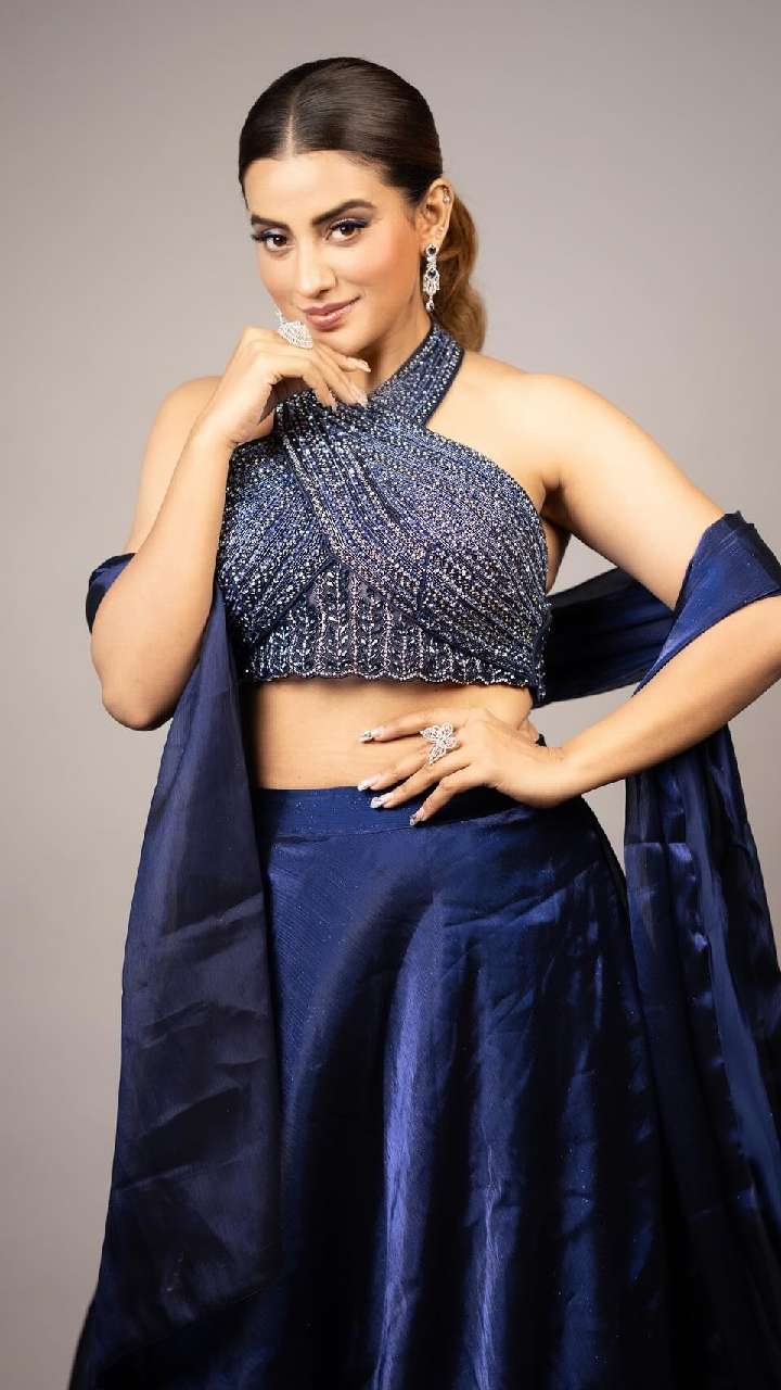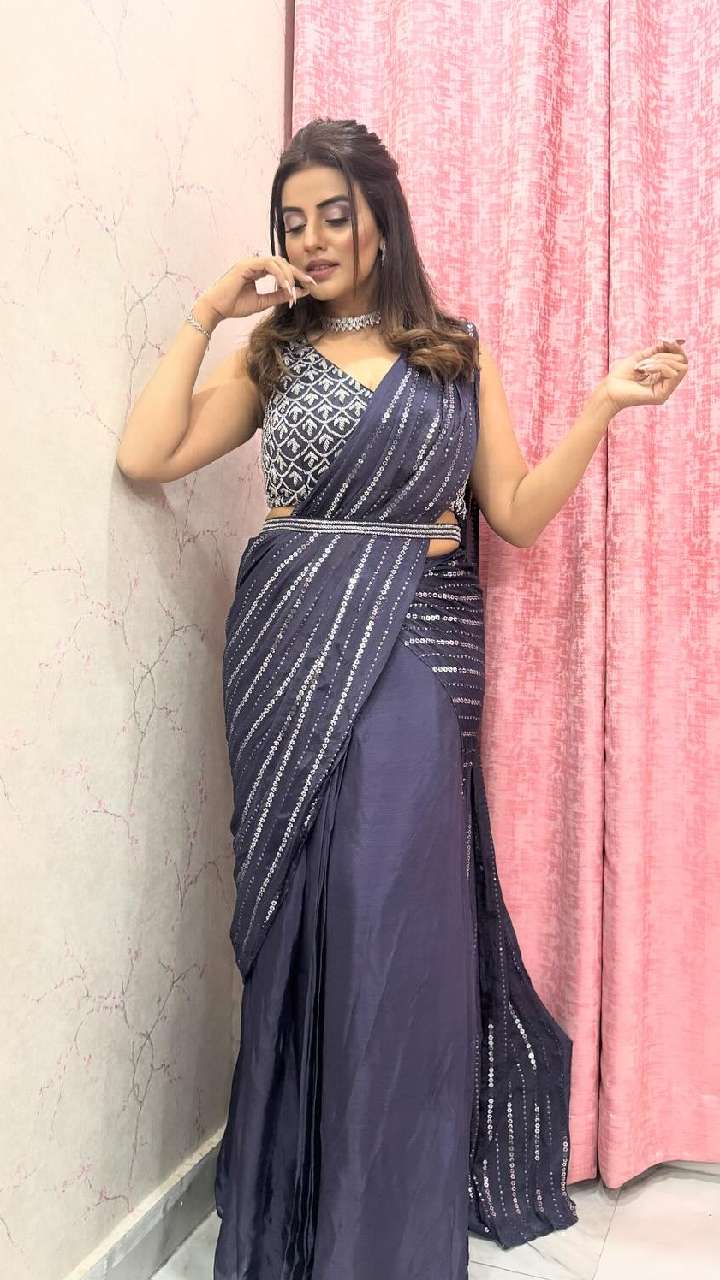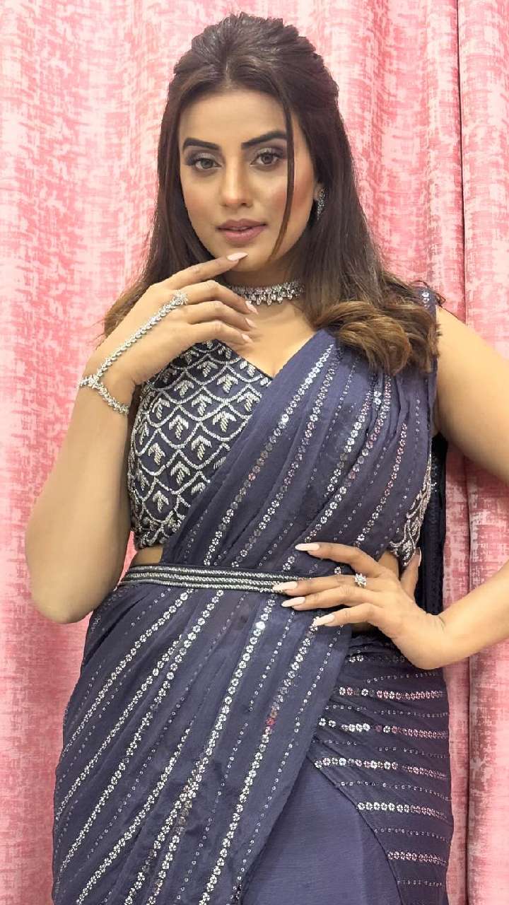 अक्षरा सिंह का ब्लू डिजाइनर साड़ी नूडल स्ट्रैप ब्लाउज और बन हेयर स्टाइल काफी अट्रैक्टिव लग रही है।