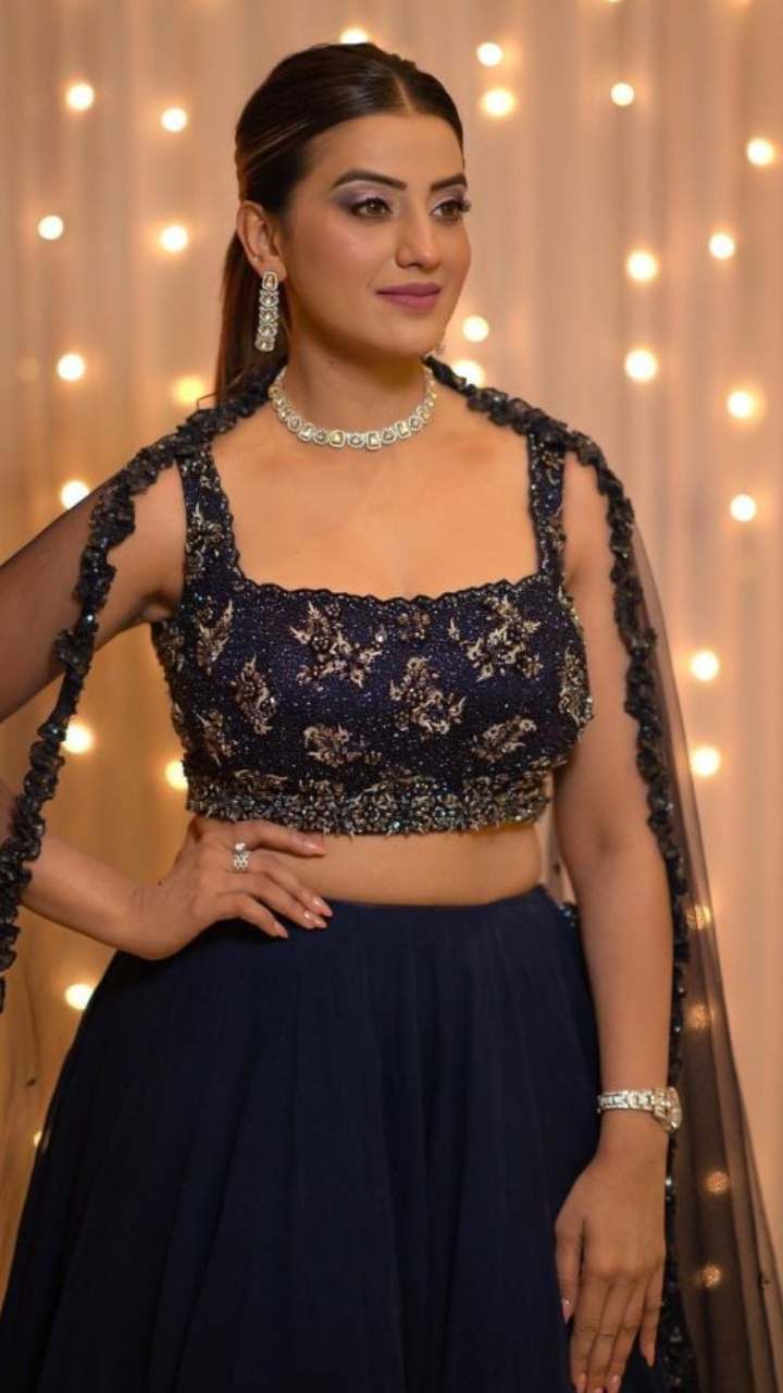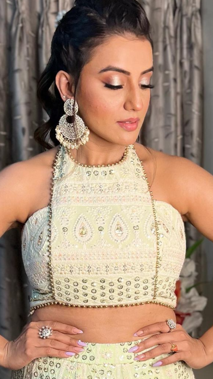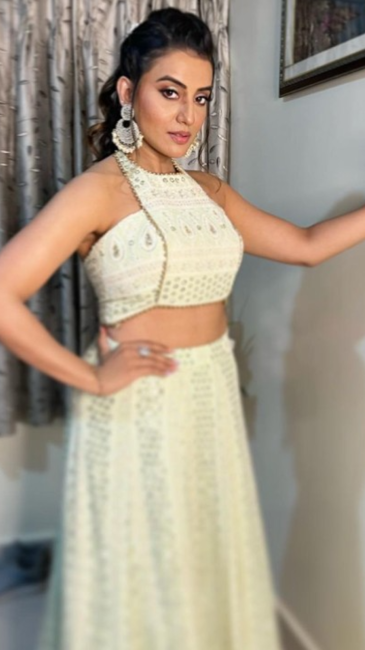 अक्षरा सिंह ने इस इंडियन लुक ड्रेस संग बोल्ड मेकअप और ग्लिटरी आईज से अपना लुक पूरा किया था।