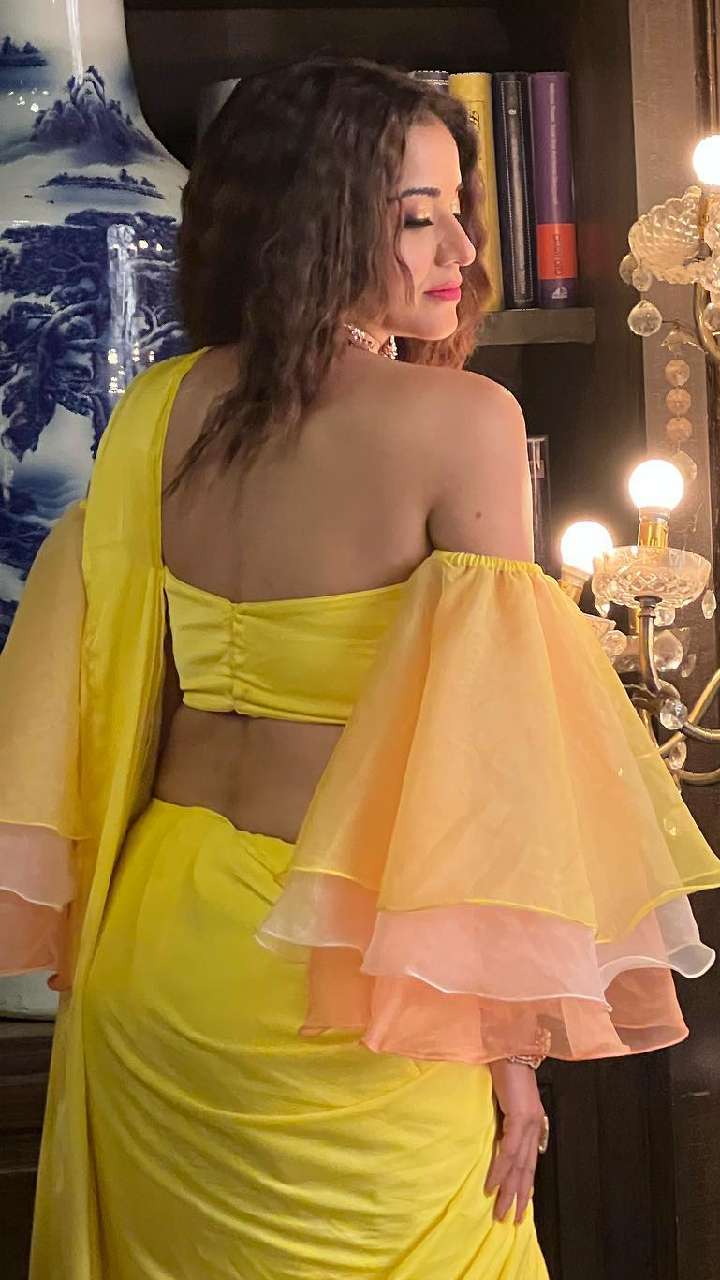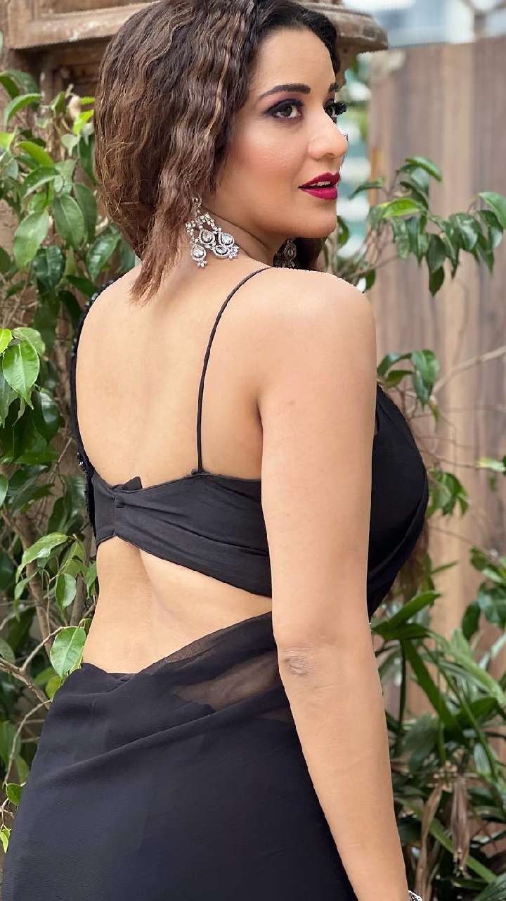 इस ब्लैक कलर के नूडल स्ट्रैप ब्लाउज के साथ मोनालिसा का बैकलेस ब्लाउज शानदार लग रहा है।