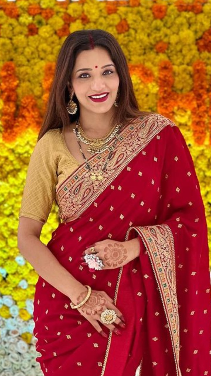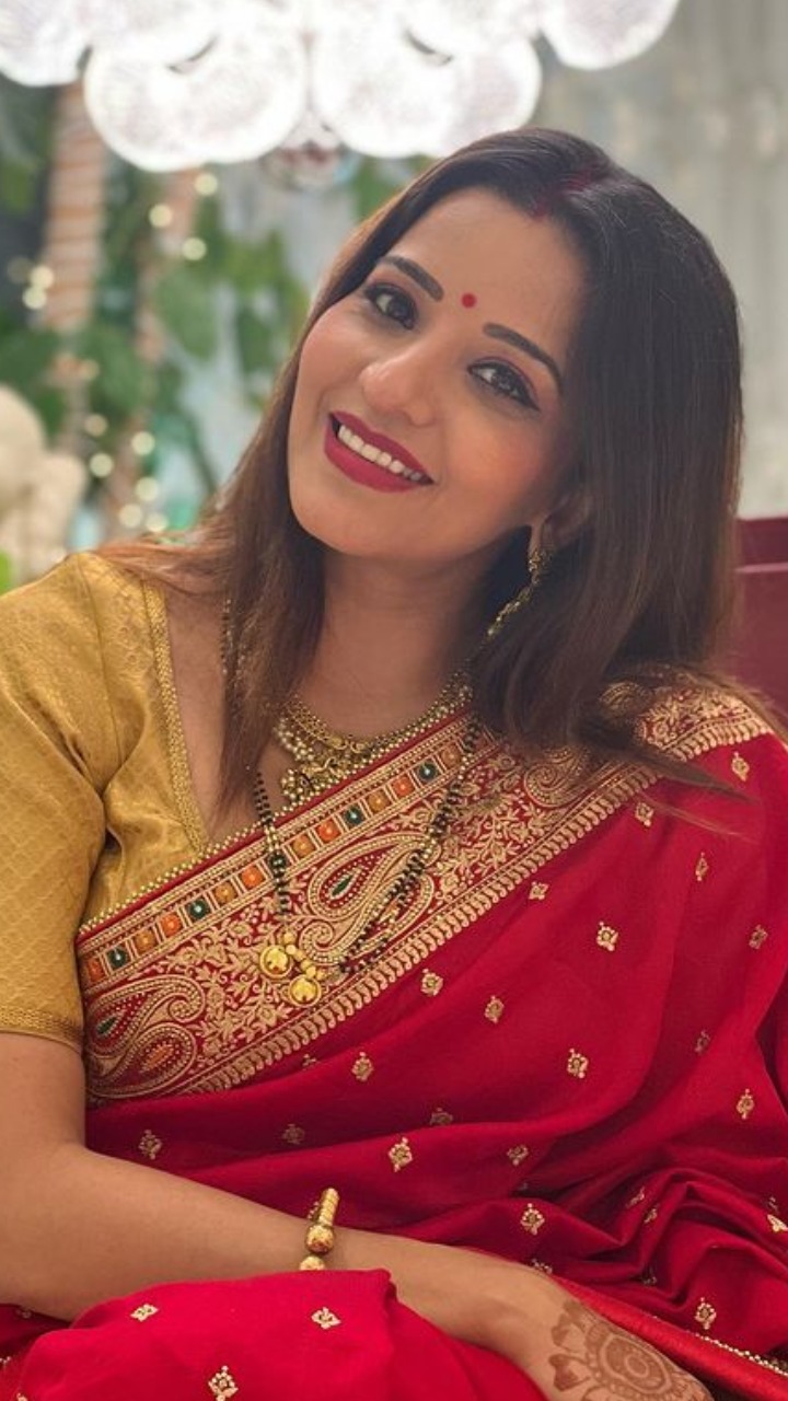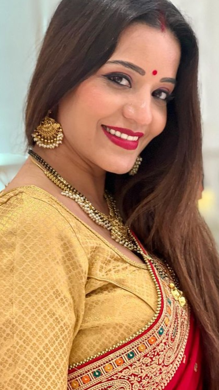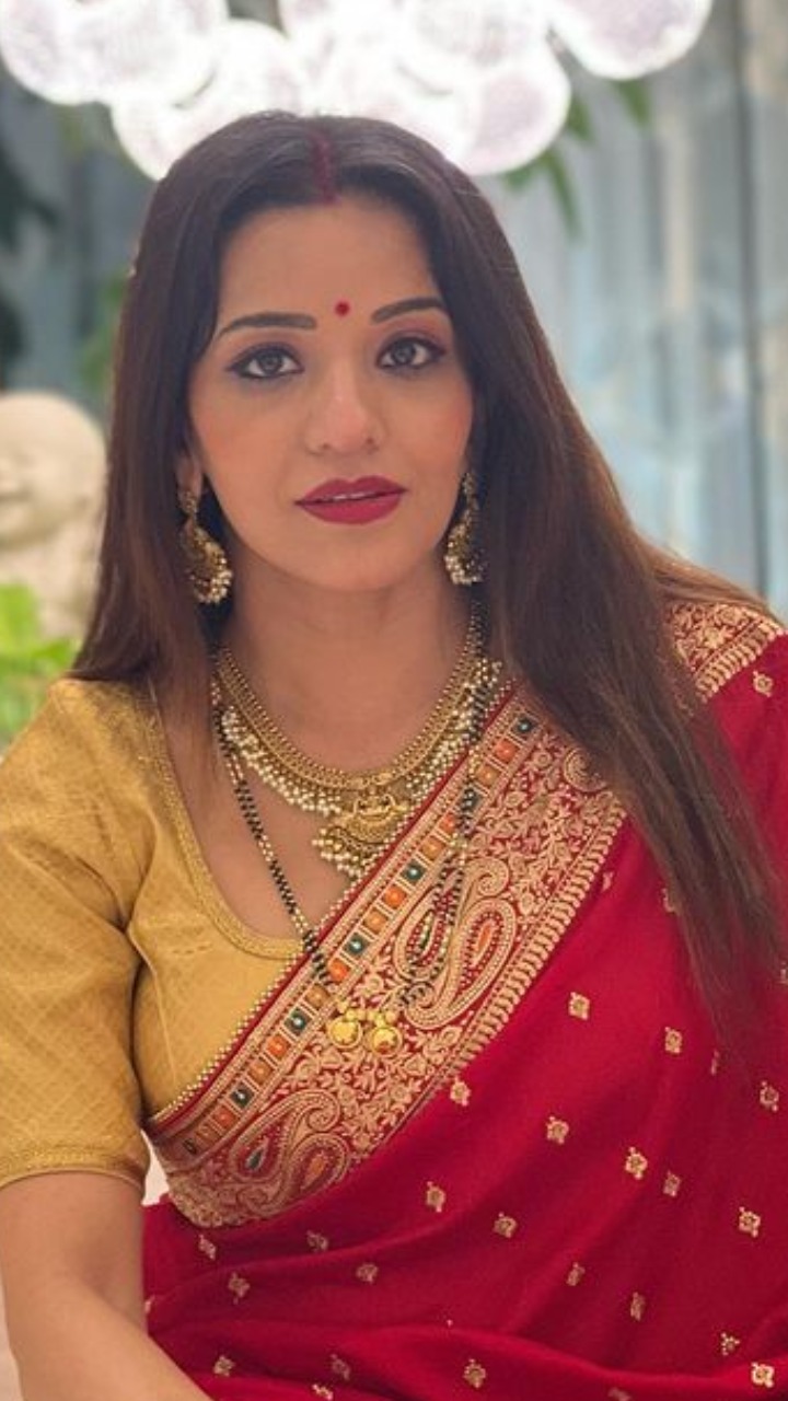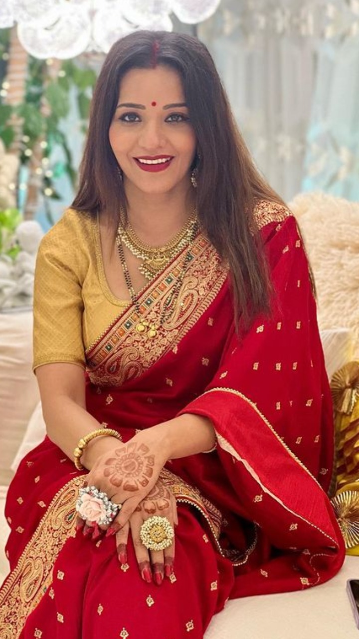 भोजपुरी एक्ट्रेस मोनलिसा रेड साड़ी में फेस्टिवल रंग में रंगी नजर आ रही हैं।