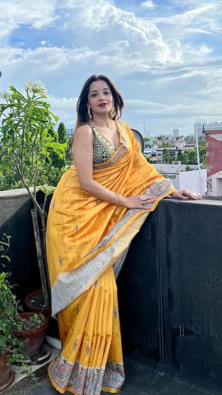 मोनालिसा की ये साड़ी दिलावी की लिए एक परफेक्ट ऑप्शन हैं।