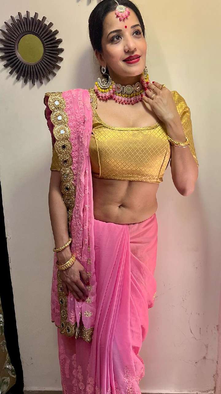 मोनालिसा का पिंक मिरर बॉर्डर साड़ी गोल्डन ब्लाउज लुक काफी ब्यूटीफुल लग रहा है। इसके साथ उन्होंने पिंक बीड्स नेकपीस और इयररिंग कैरी किए हैं।