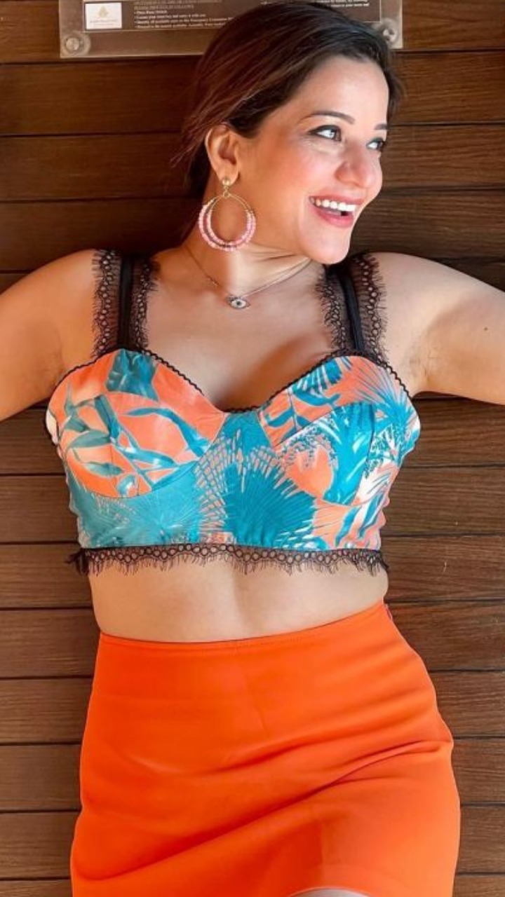 लेटेस्ट पोस्ट में एक्ट्रेस ने ब्लू और ऑरेंज कलर का ब्रालेट और शॉर्ट स्कर्ट कैरी की हुई हैं। मोनालिसा इस लुक में बेहद हॉट लग रही हैं।