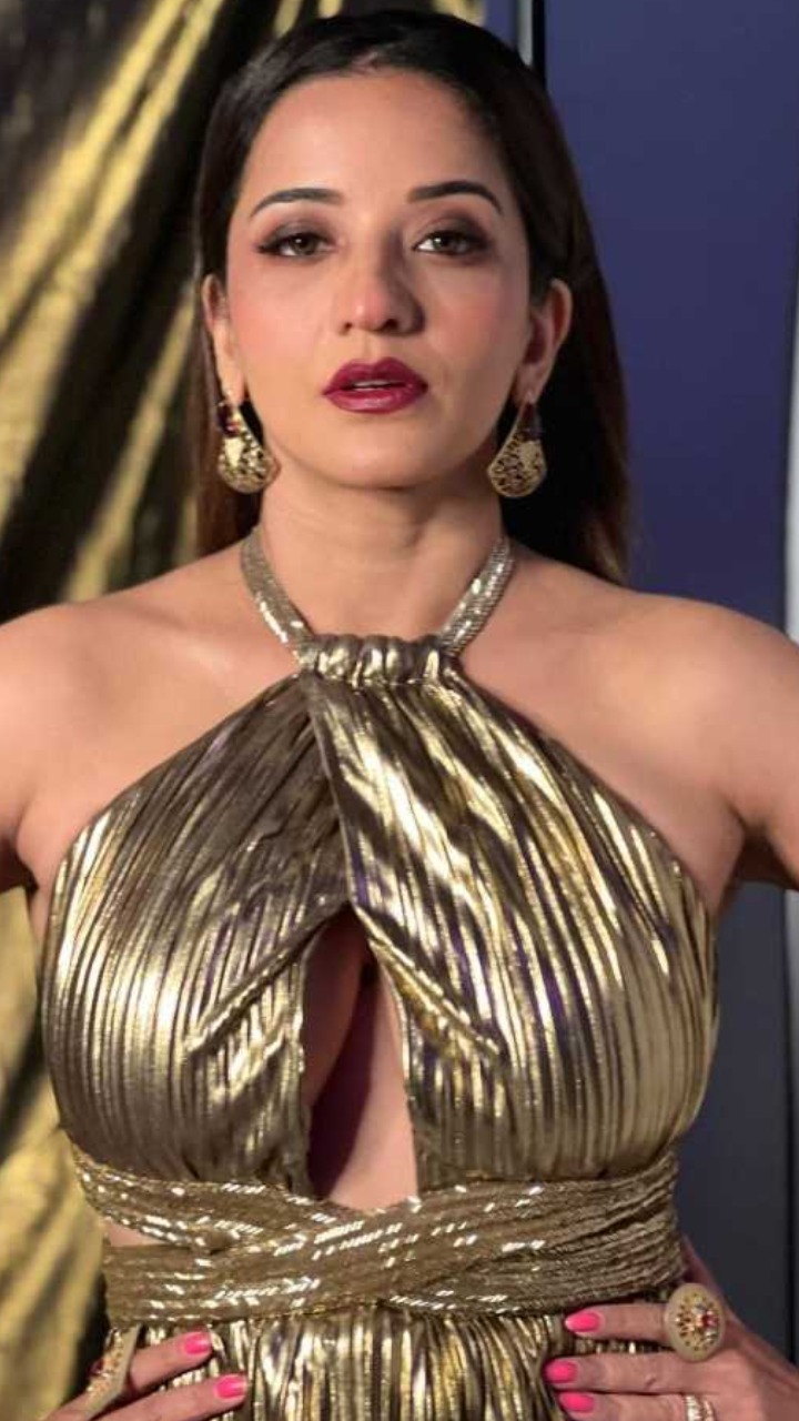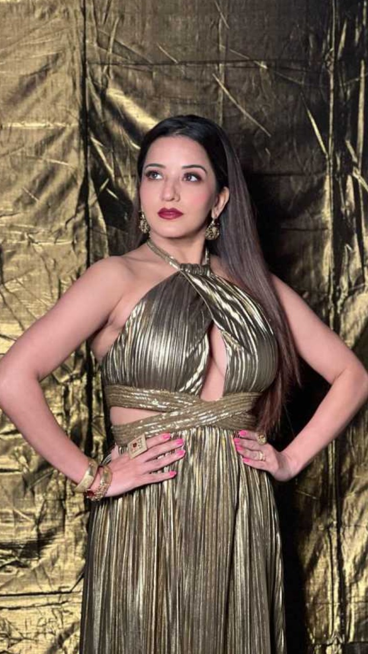 मोनालिसा ने गोल्डन ड्रेस पहनी हैं जिसे उनके फैंस बहुत पसंद कर रहे हैं।