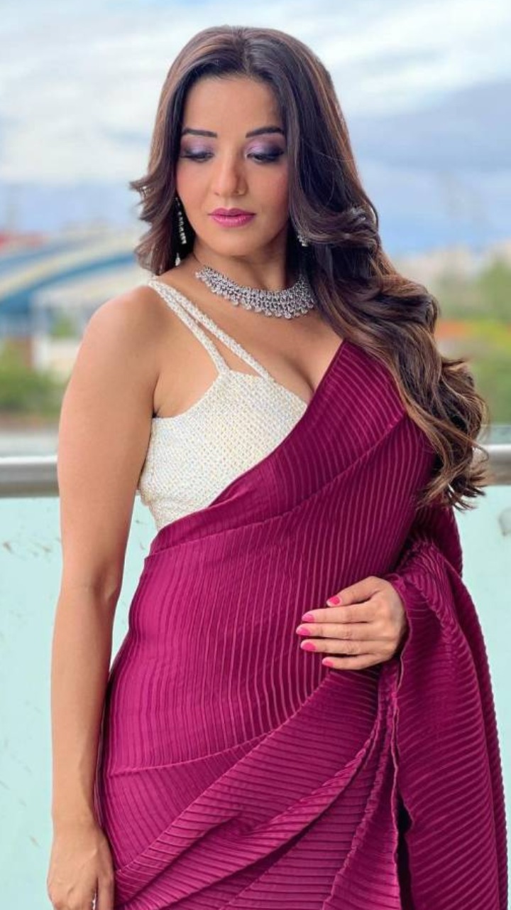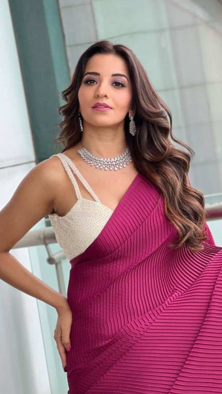 फोटो में मोना ने पिंक कलर की साड़ी, सिल्वर कलर का ब्लाउज और नेकलेस पहना हुआ हैं। तस्वीर में एक्ट्रेस का वेवी हेयर उनके लुक में चार चांद लगाने का काम कर रहा है।
