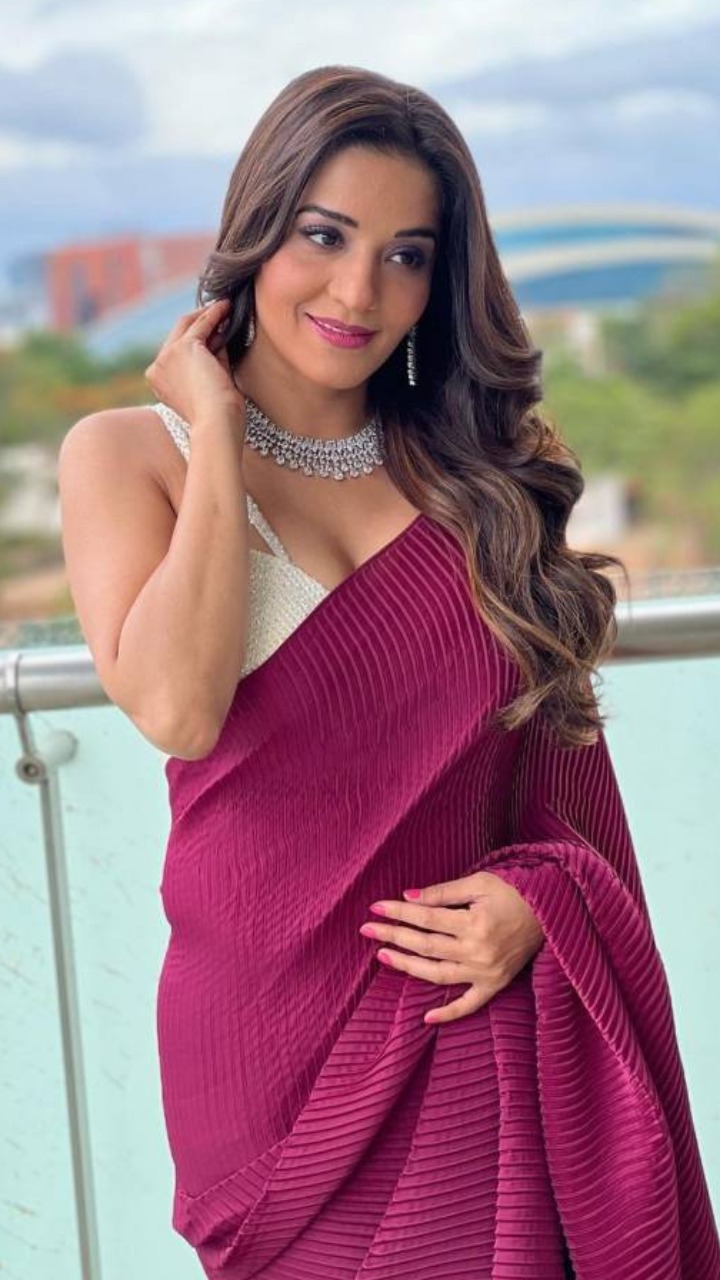 पिंक कलर की साड़ी में मोनालिसा अपने कातिलाना अंदाज से फैंस को घायल करने का काम कर रही हैं।