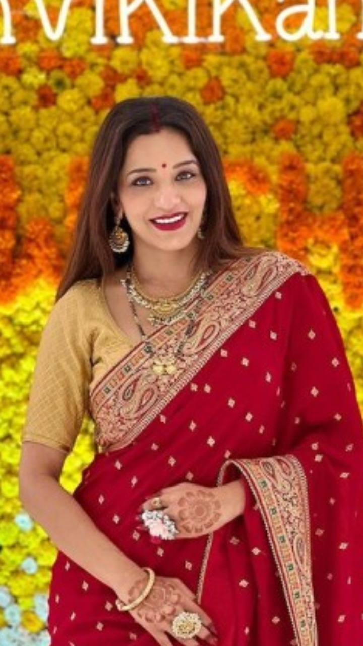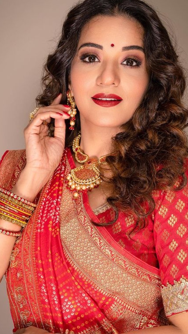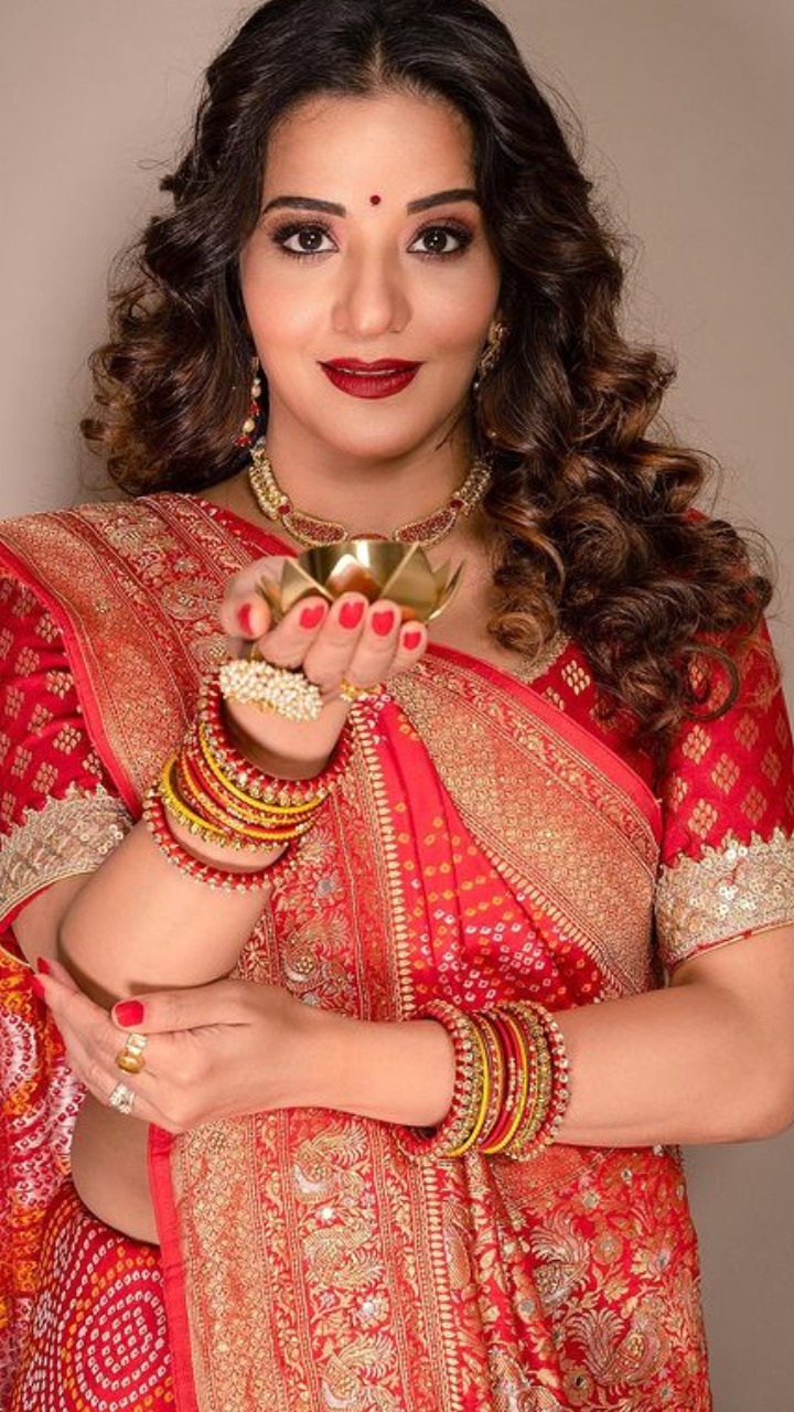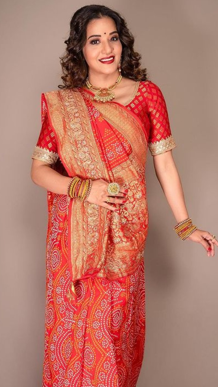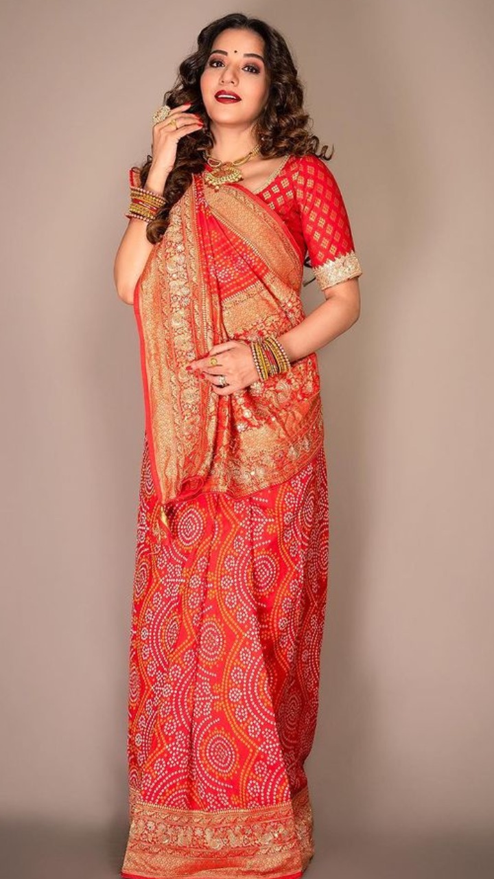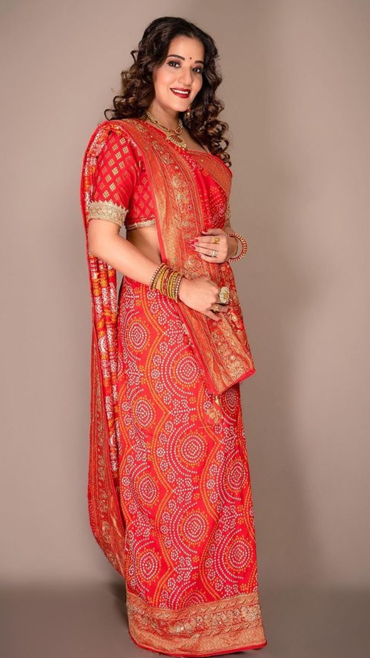 मोनालिसा ने चुंदरी प्रिंट साड़ी संग माथे पर लाल बिंदी, हाथों में चूड़ियां,रेड ;लिपस्टिक पहन एकदम भारतीय नारी वाला लुक लिया है।