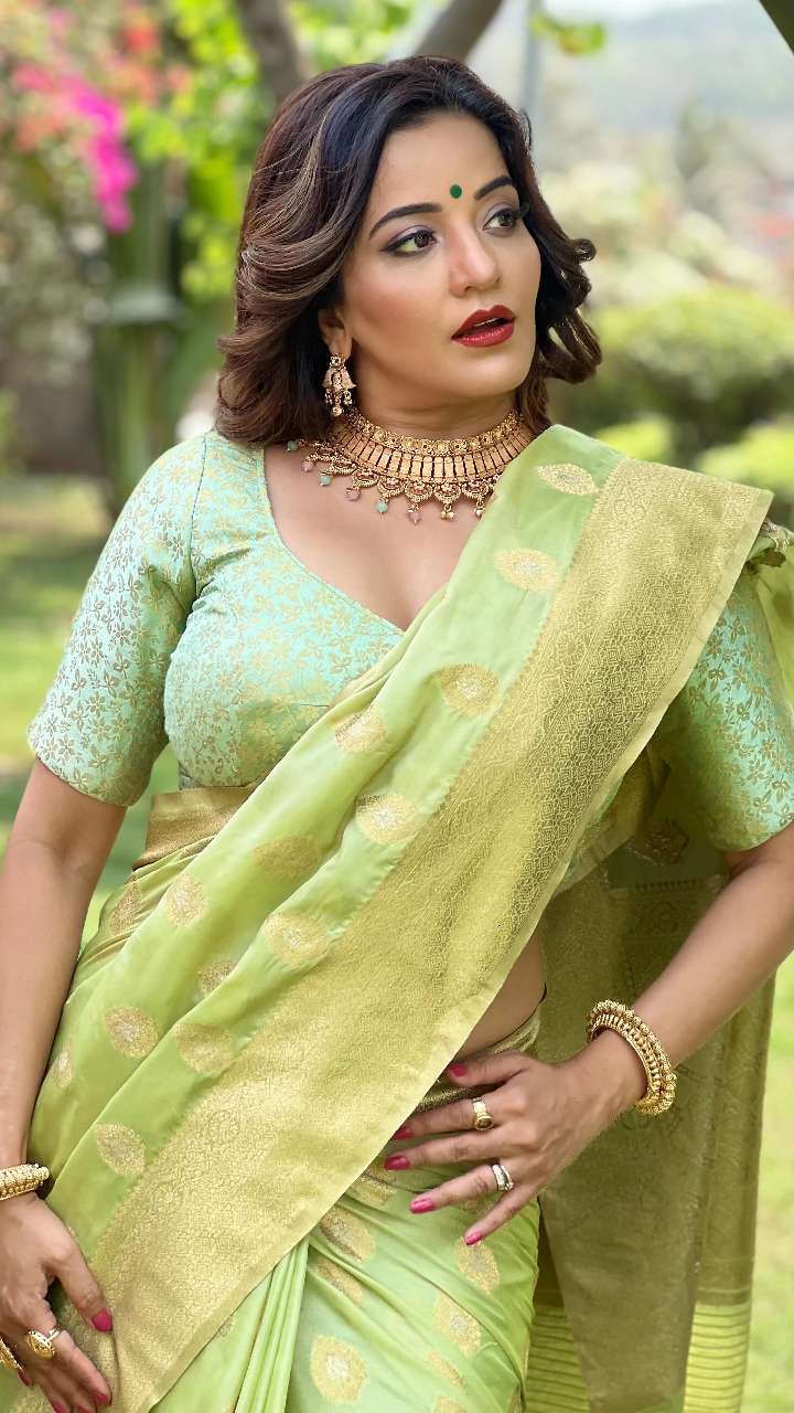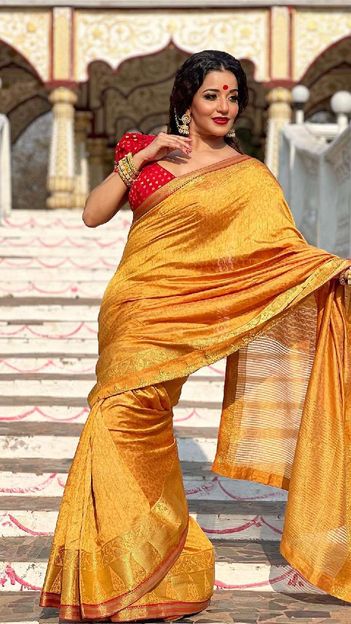 त्योहारों पर अपने लुक में चार चांद लगाना चाहती हैं, तो आप मोनालिसा के जैसी येलो साड़ी कंट्रास्ट गोटा वर्क ग्रीन ब्लाउज को स्टाइल कर सकती हैं।
