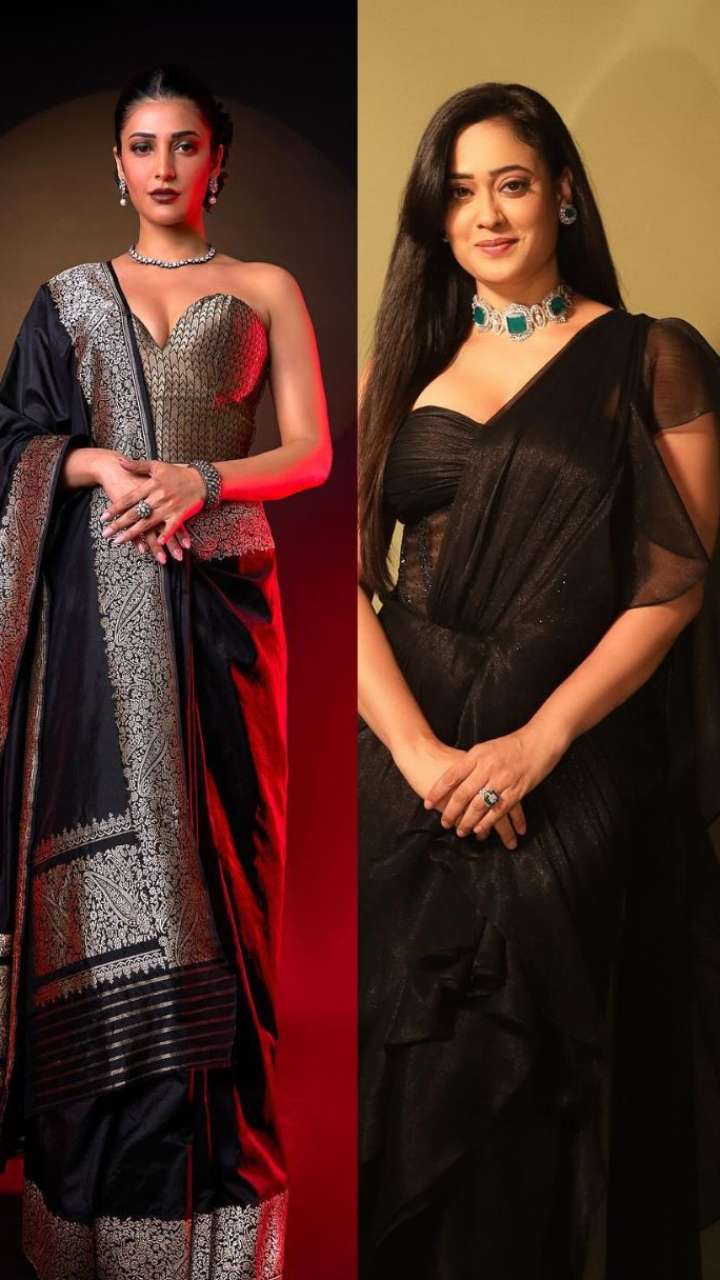 इस तस्वीर में आप अभिनेत्री की ब्लैक साड़ी कर्ली हेयर के साथ डीपनैक नूडल स्ट्रैप ब्लाउज में सिजलिंग अदाएं देख सकते हैं।