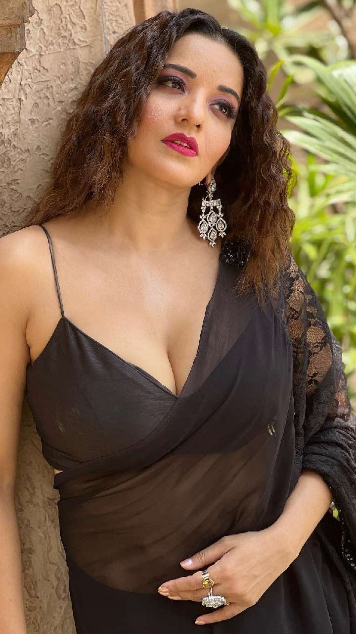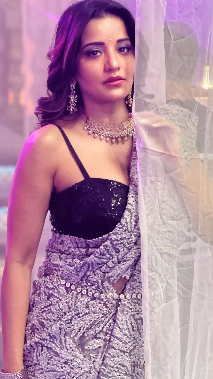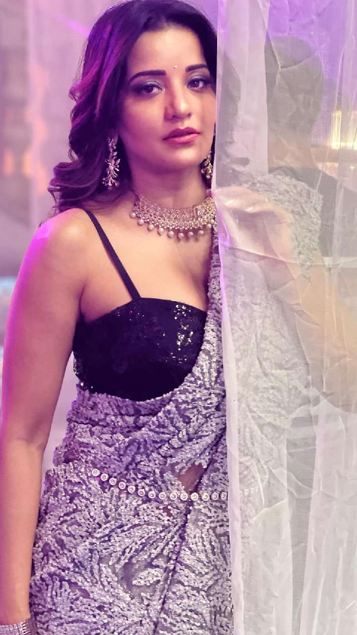हाल में मोनालिसा ने ऑरेंज कलर की नेटिड सितारों के वर्क वाली साड़ी के साथ प्लेन स्ट्रैपी ब्लाउज से खुद को बोल्ड लुक दिया हुआ है।