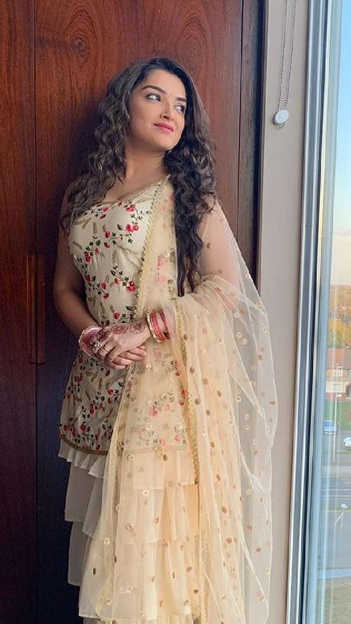 भोजपुरी एक्ट्रेस का ये फ्लोरल प्रिंट सूट लुक काफी ब्यूटीफुल लुक दे रहा है।