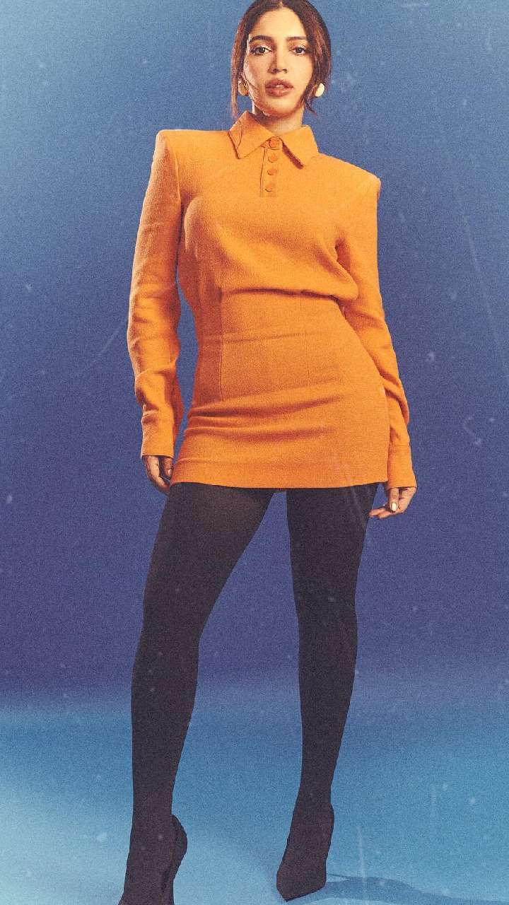 भूमि ऑरेंज कलर की कॉलर शार्ट ड्रेस में काफी स्टाइलिश लग रही हैं। इसके संग उन्होंने स्टॉकिंस वियर किए हुए हैं।