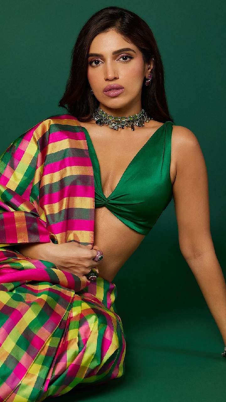 चौड़े कंधे वाली महिलाओं पर ऐसे कोर्सेट ब्लाउज खूब जचती हैं। अगर आप साड़ी में पेट छुपाना चाहती हैं, तो भूमि का ये ब्लाउज कॉपी करें।
