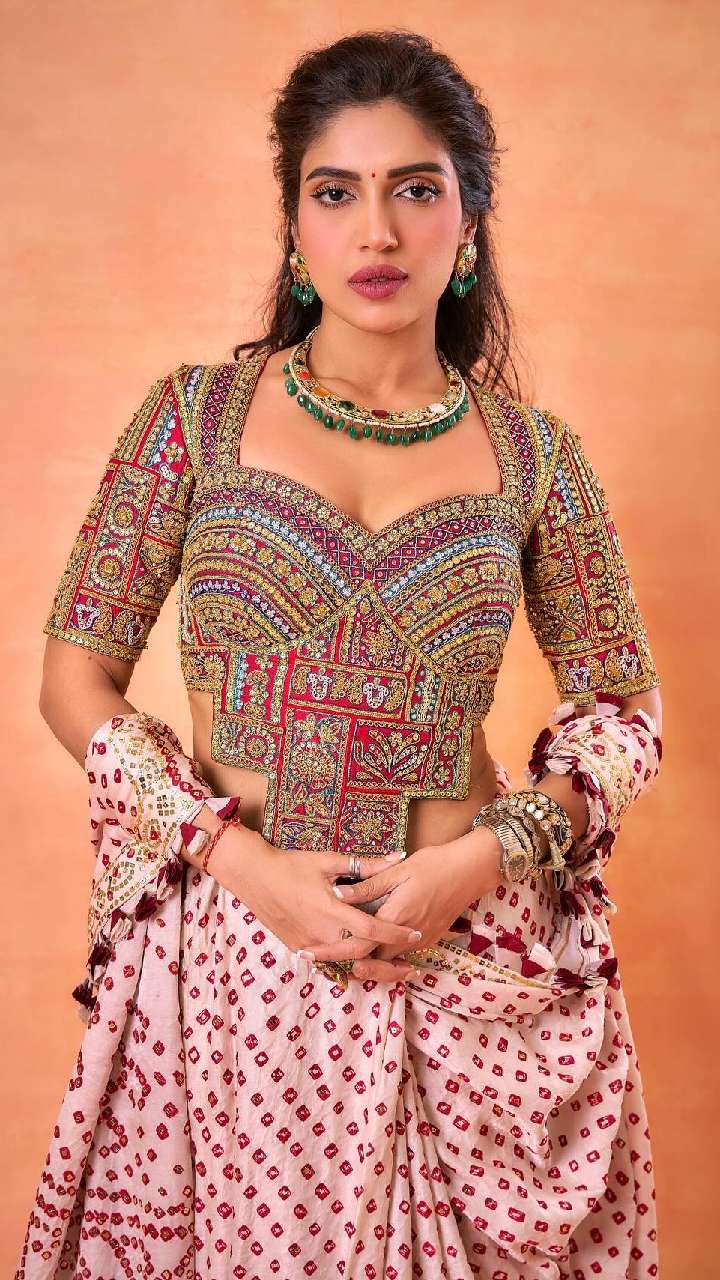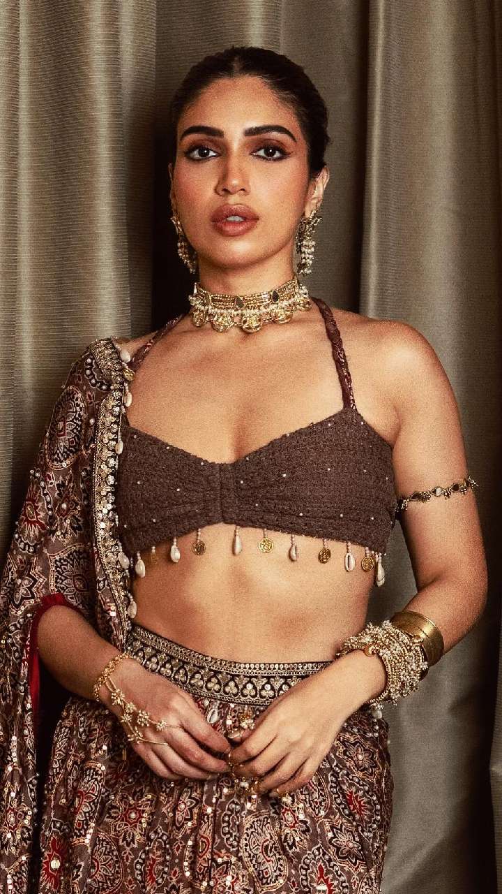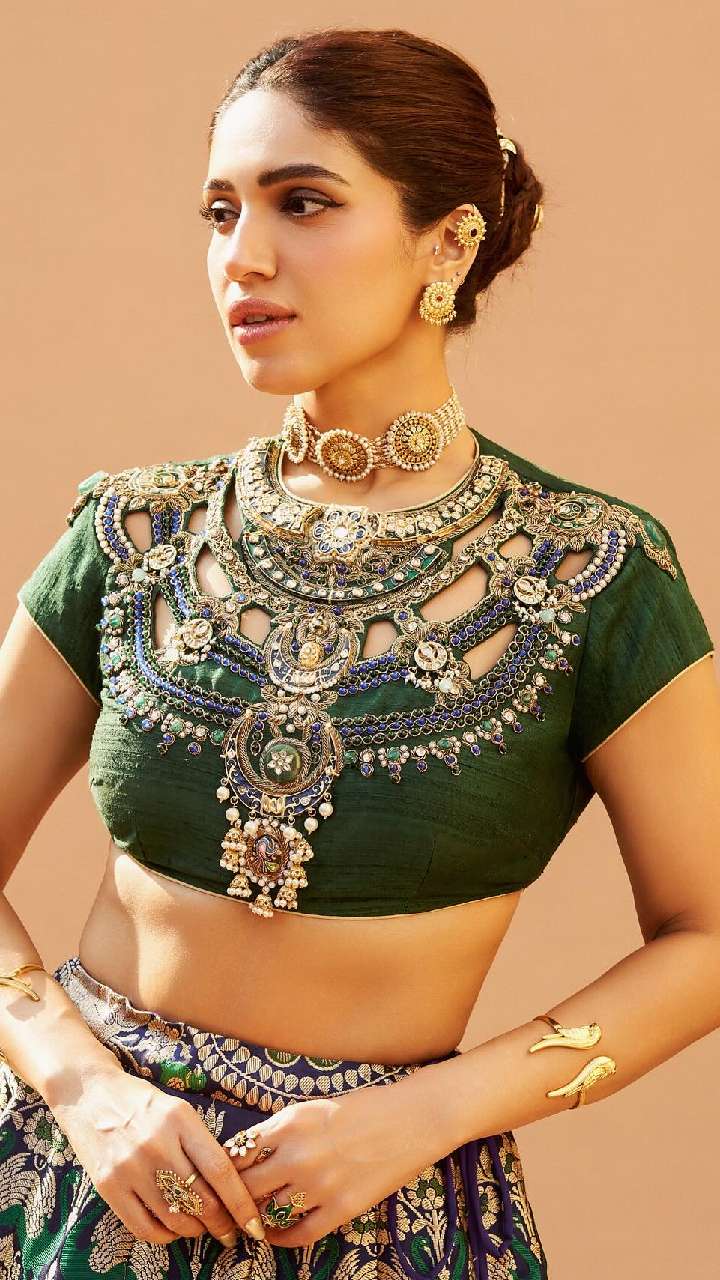 भूमि ने लहंगा के साथ हाई नेक ब्लाउज पेयर किया है। आप भी उनकी तरह ऐसे ब्लाउज डिजाइन अपने टेलर से सिलवाएं।