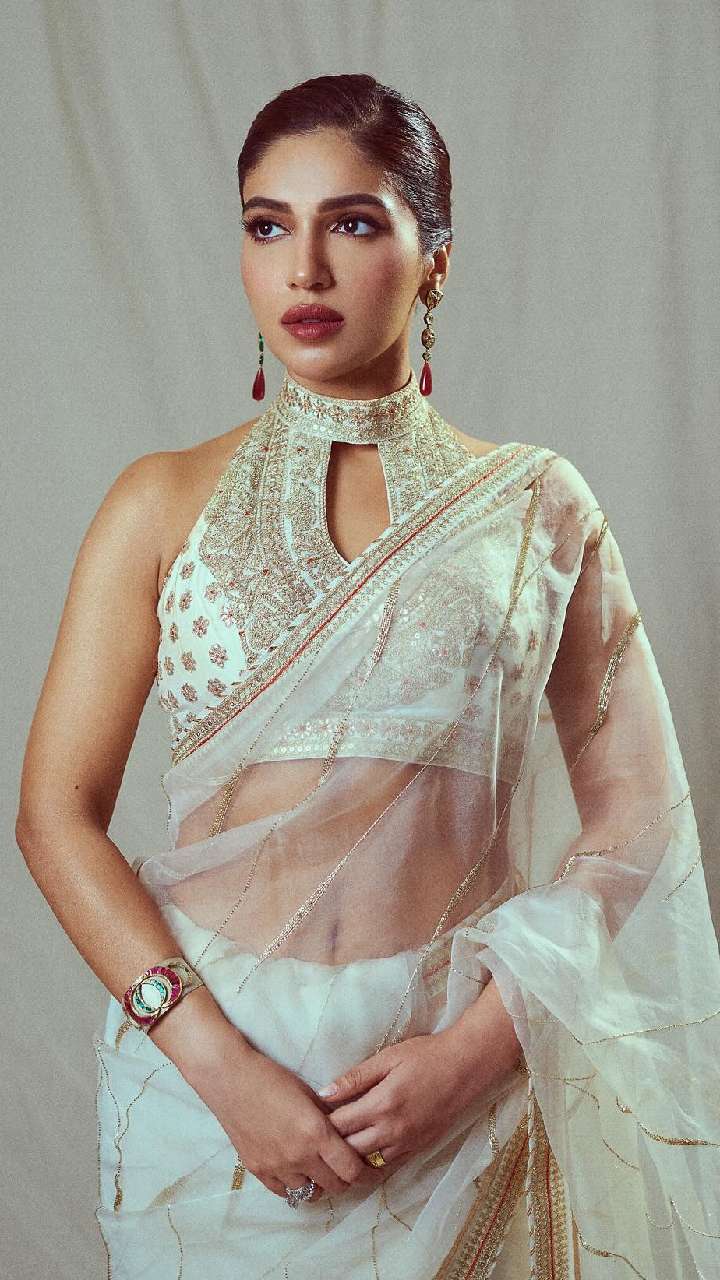 भूमि ने व्हाइट कलर की साड़ी के साथ हाई नेक ब्लाउज पहना हुआ है। जिसे आप भी अपना फेस्टिव लुक बना सकती हैं।