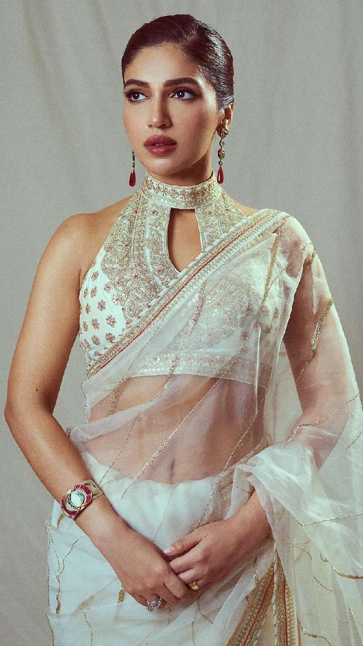 भूमि ने व्हाइट कलर की साड़ी के साथ हाई नेक ब्लाउज कैरी किया है, जिसमें वह काफी सुंदर लग रही हैं। ऐसे ब्लाउज डिजाइन को आप साड़ी के लिए चुन सकती हैं।