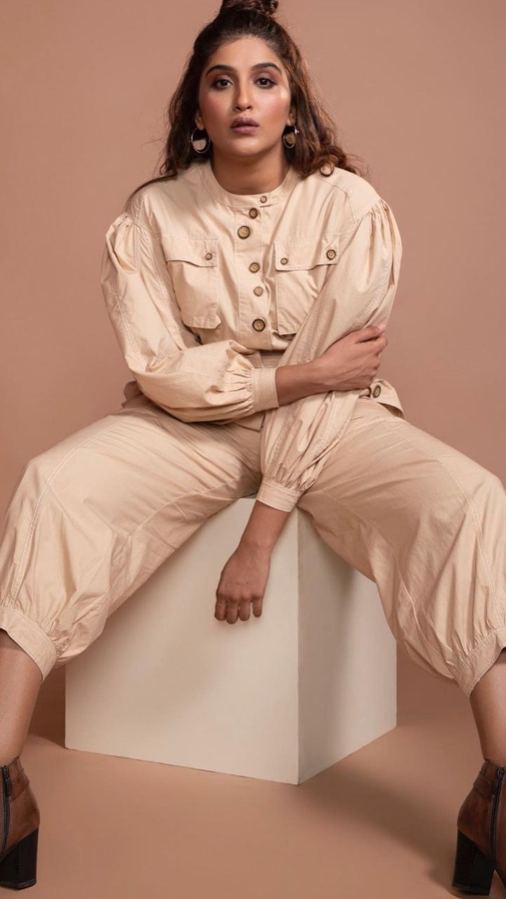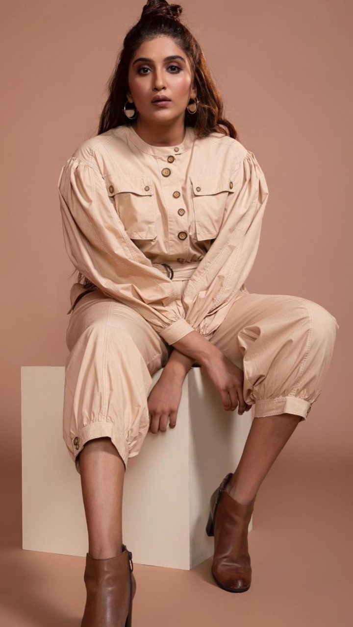 बिग बॉस कंटेस्टेंट ने फोटो में ब्राउन कलर का जंपसूट, मैचिंग इयररिंग्स और अपने पैरों में ब्राउन कलर का बूट पहना हुआ हैं।