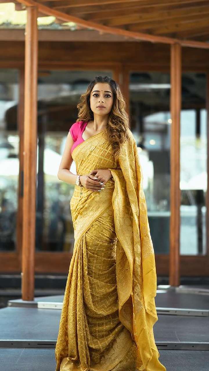एक्ट्रेस की ये धोती स्टाइल साड़ी बेहद खूबसूरत लग रही है।