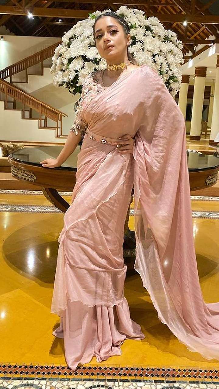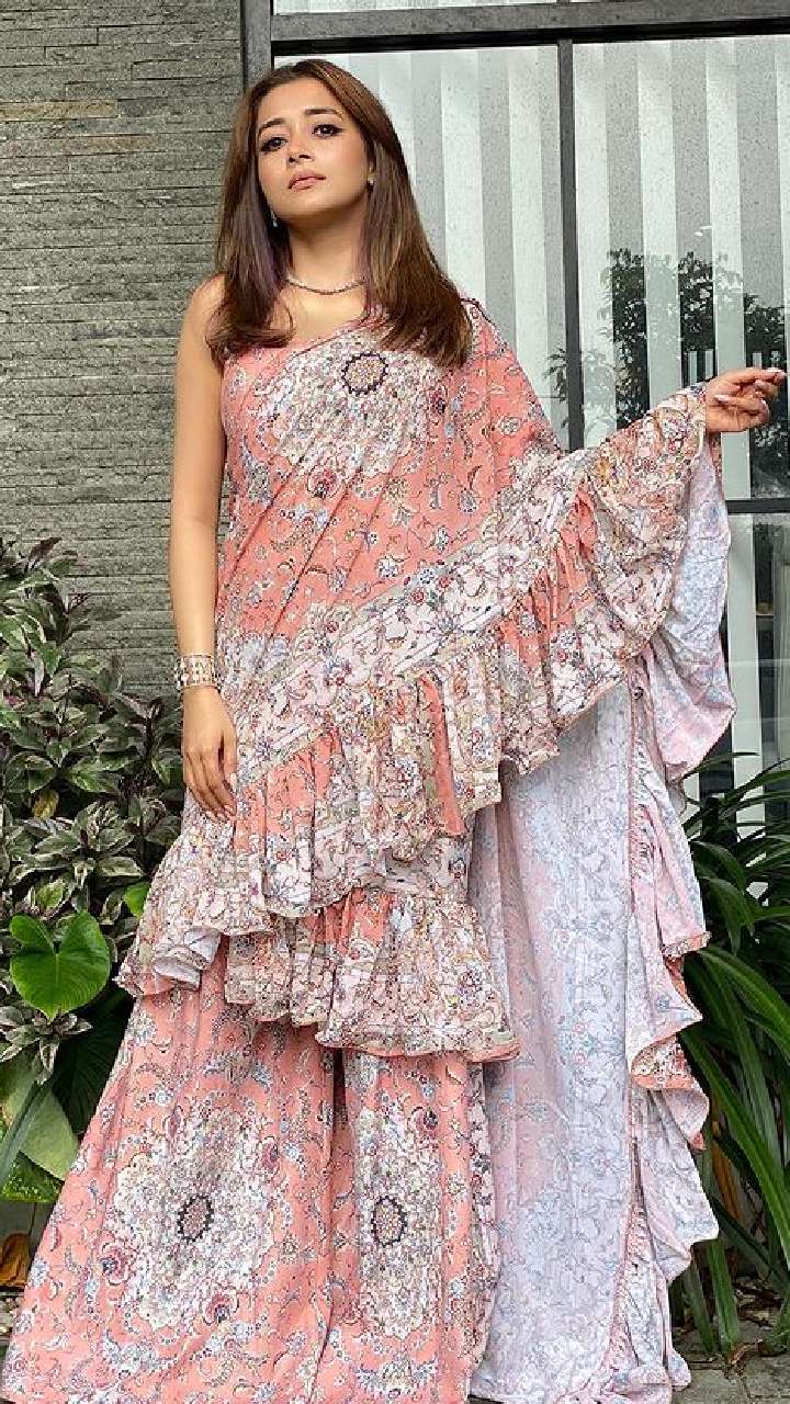टीना इस पीच कलर की रेडी टू वियर डिजाइनर साड़ी संग बेल्ट लुक में बेहद क्लासी लुक दे रही हैं।
