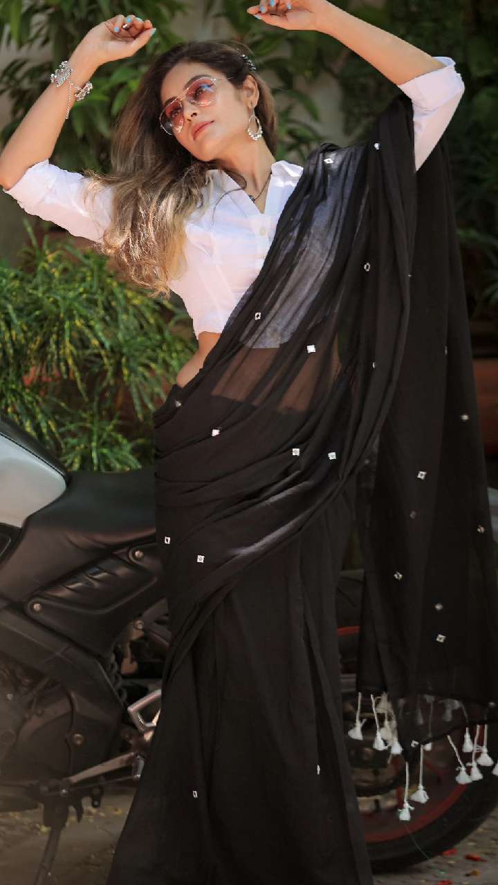 एक्ट्रेस ब्लैक कलर की जॉर्जेट साड़ी के साथ व्हाइट कलर के शर्ट स्टाइल ब्लाउज में काफी स्मार्ट लग रही हैं। यंग गर्ल्स उनके इस लुक को ट्राई कर सकती हैं।