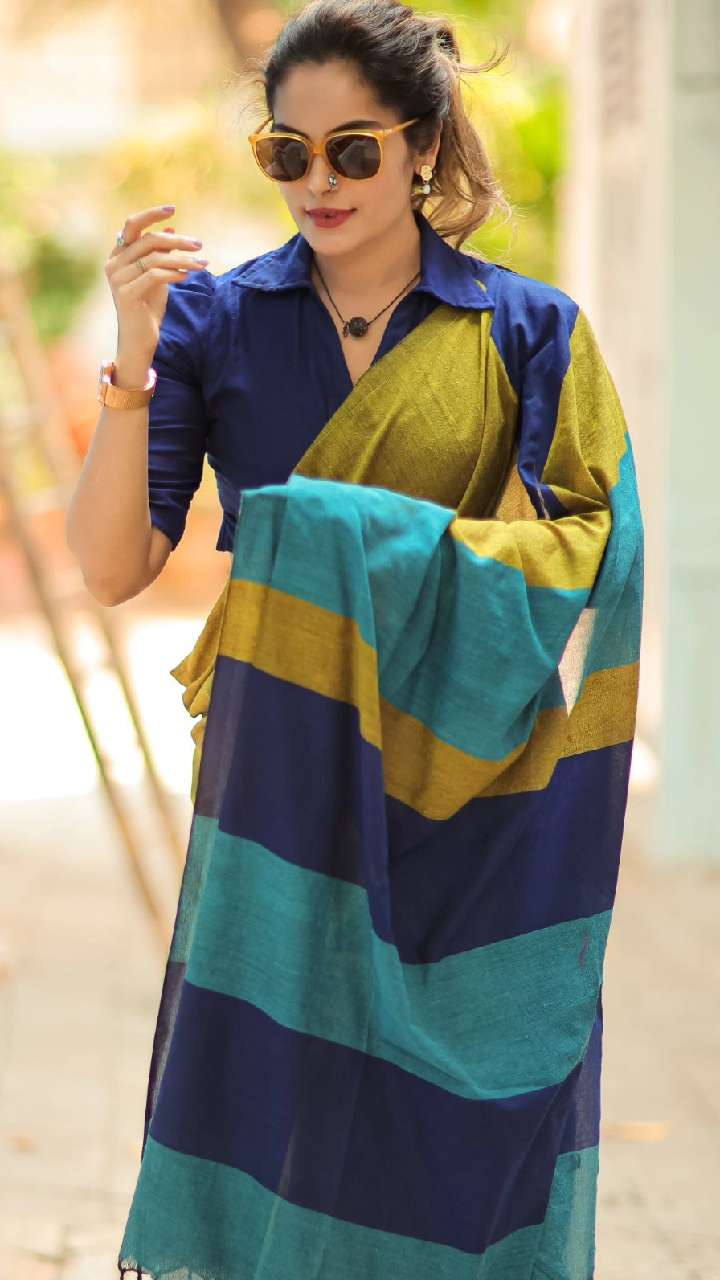 श्रुतिका का सिंपल सोबर डबल शेड कॉटन सिल्क साड़ी जीरो नेक फ्लोरल ब्लाउज में लुक काफी स्टाइलिश नजर आ रहा है। इससे भी आप आइडिया ले सकती हैं।