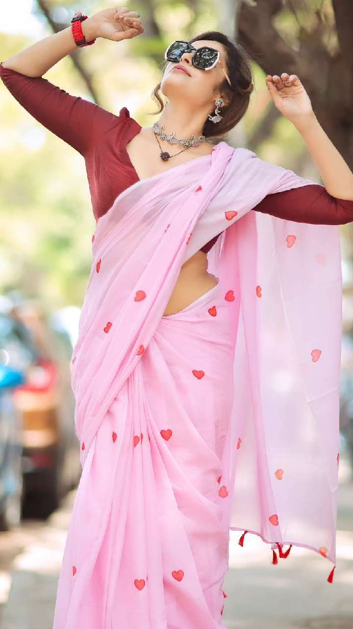 अभिनेत्री पिंक कलर की हार्ट प्रिंट साड़ी प्लेन एल्बो लेंथ ब्लाउज में काफी शानदार लग रही हैं। ऑफिस में आप इसे स्टाइल कर सकती हैं।