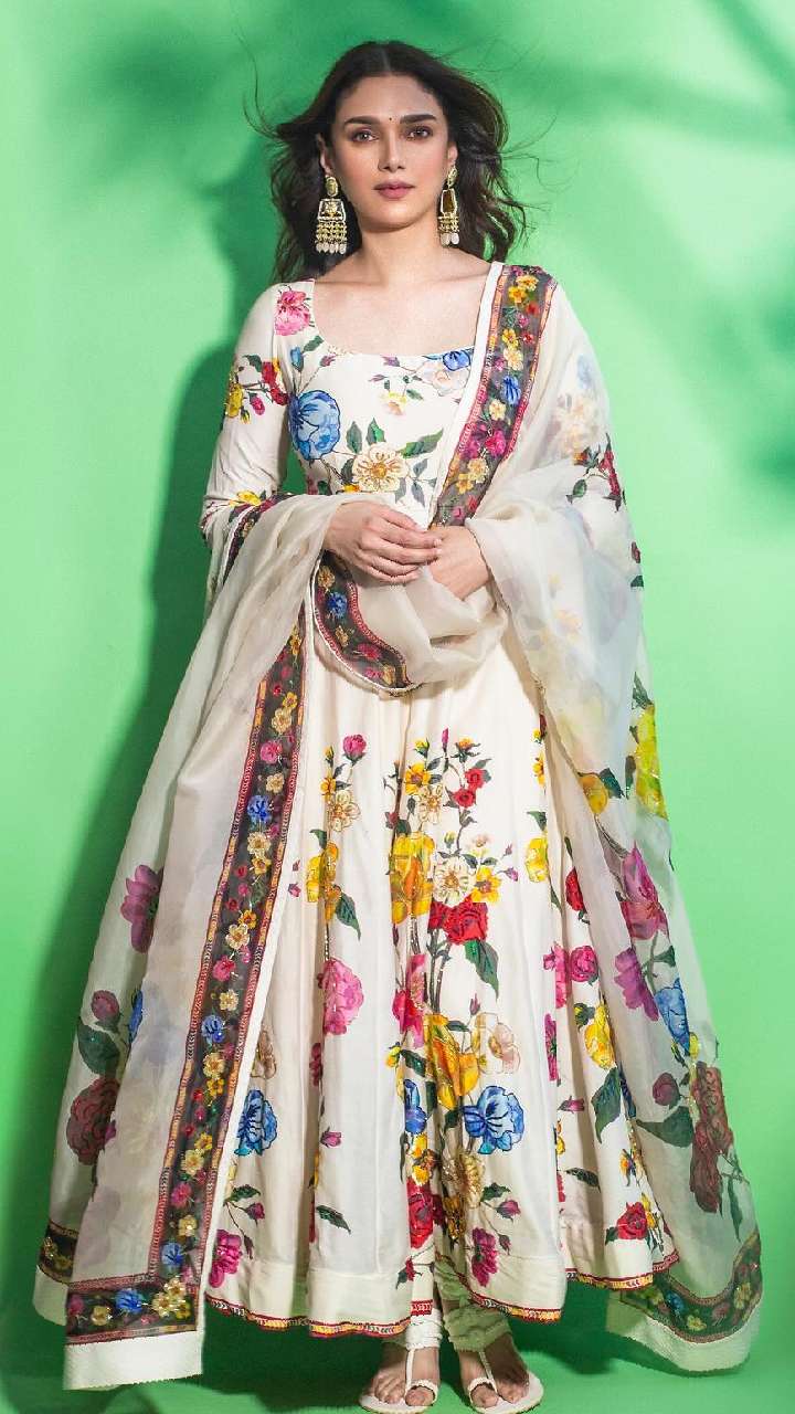अदिति प्रिंटेड अनारकली सूट में अप्सरा जैसी लग रही हैं। इस तरह के सूट हर मौके पर खास लगते हैं। इसके साथ ऑक्सिडाइज्ड इयररिंग्स कैरी करें।