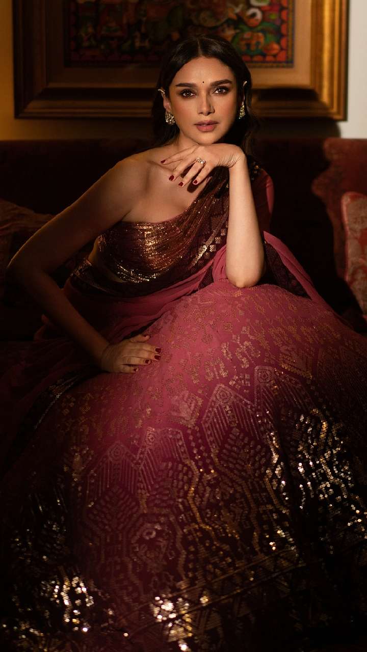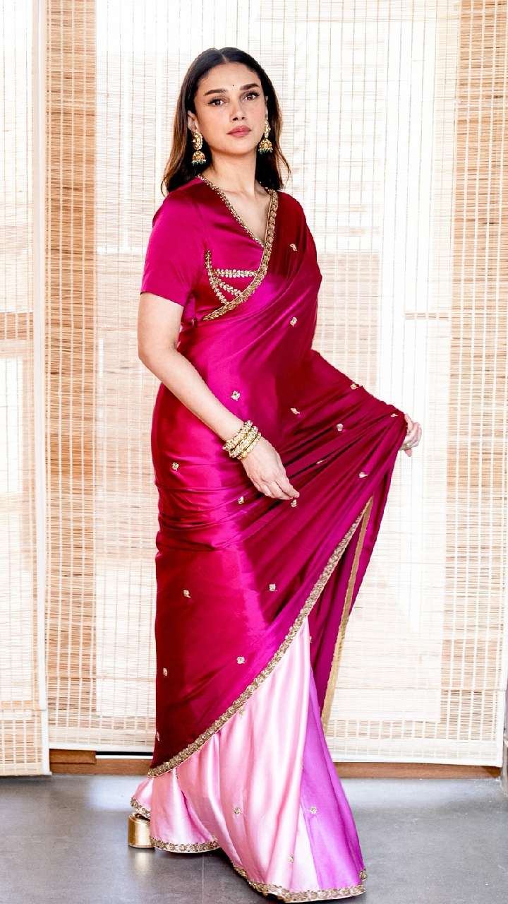 अदिति के पास साड़ियों का शानदार कलेक्शन है। आप भी एक्ट्रेस के इस साटन साड़ी लुक को कॉपी करना न भूलें।