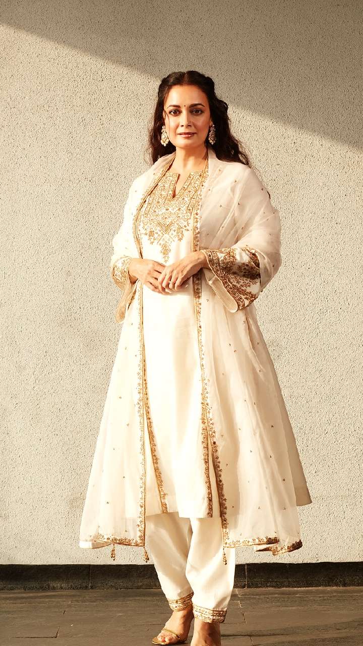 दीया मिर्जा व्हाइट अनारकली सूट में बला की खूबसूरत लग रही हैं। इसके साथ उन्होंने गोल्डन ज्वेलरी कैरी की है, जो उनके लुक में चार-चांद लगा रहा है।