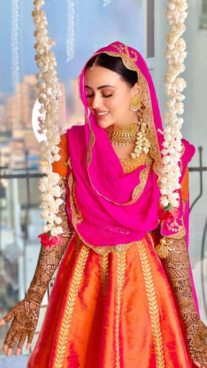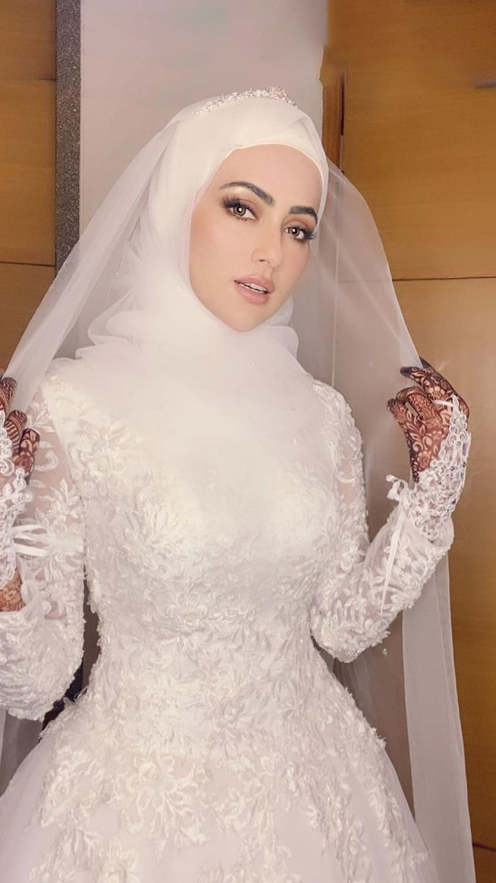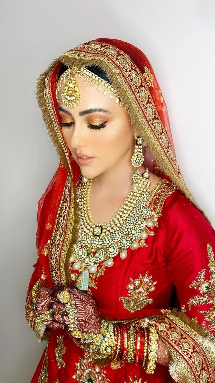 सना अपने इस लाल कलर के ड्रेस में काफीं अट्रैक्टिव लग रही। सना का यह वलिमा लुक है।