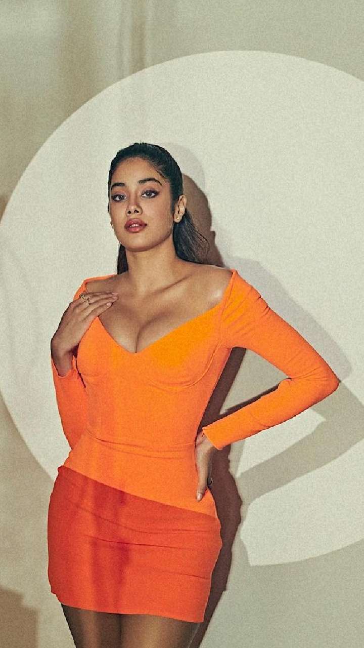जाह्नवी कपूल इस ऑरेंज शॉर्ट बॉडीकॉन ड्रेस में बेहद ही हॉट दिख रही हैं।