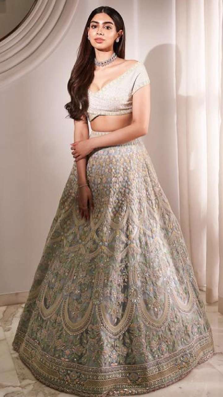 अगर आप शादी या रिसेप्शन पार्टी में लहंगा पहनने का सोच रही हैं, तो इस थ्रेड वर्क लहंगा से आइडिया लें। खुशी कपूर ने लुक को कंप्लीट करने के लिए स्टाइलिश ब्लाउज पेयर किया है।