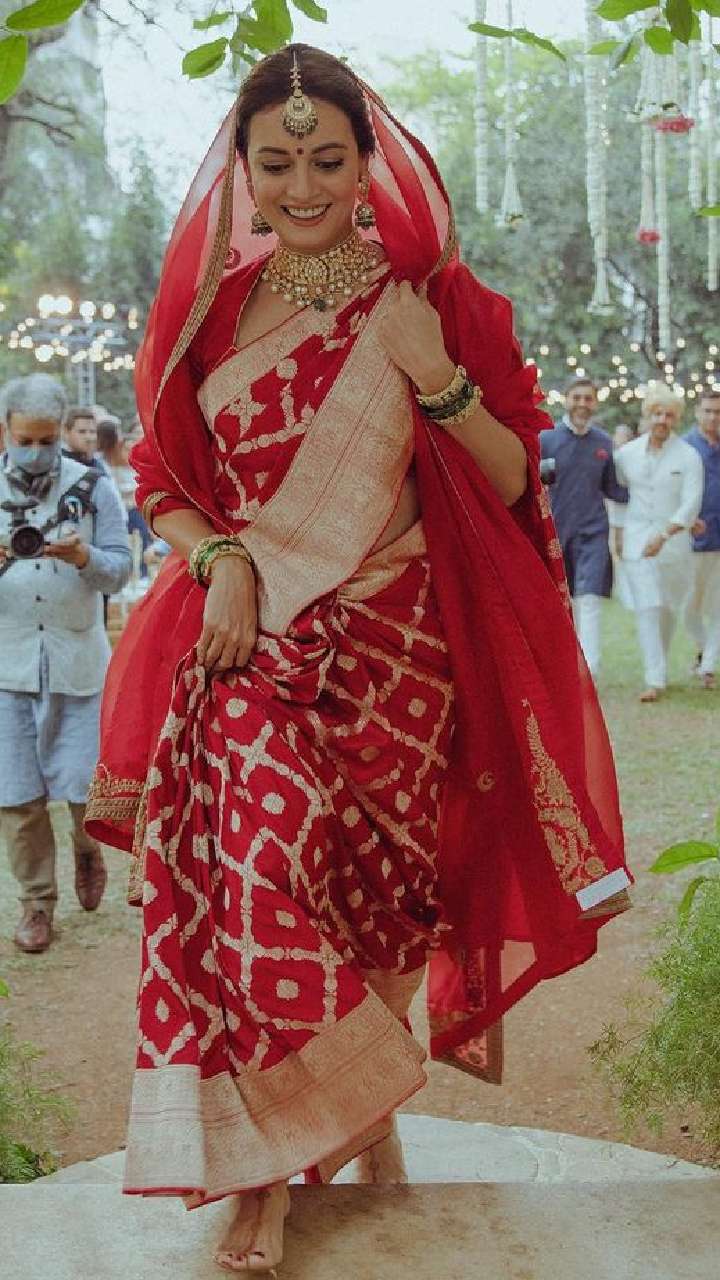 दिया मिर्जा ने भी शादी पर रेड कलर की सिल्क साड़ी कैरी की थी।
