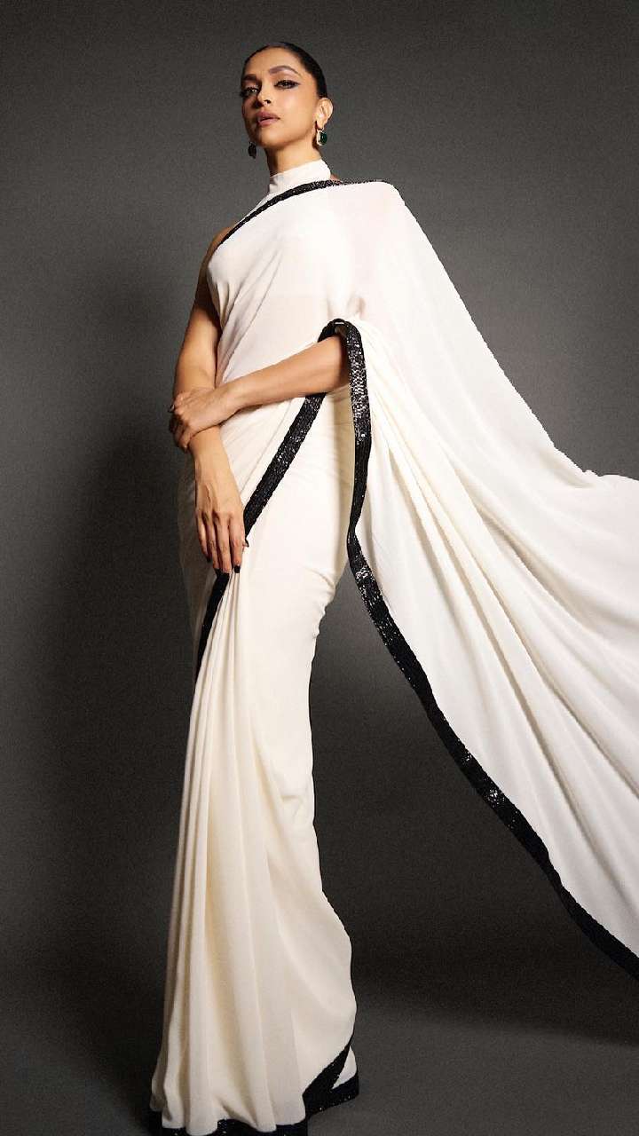 फैशन क्वीन दीपिका पादुकोण का हर लुक बेहद कमाल का होता है। इस फोटो में उन्होंने व्हाइच साड़ी को ग्रेसफुली कैरी किया है, जिसमें वह काफी सेसी लग रही हैं। उनका ये लुक पार्टी के लिए एकदम परफेक्ट है।