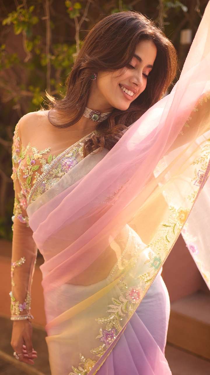 हॉट शिमरी साड़ी में जान्हवी कपूर बहुत ग्लैमरस नजर आ रही हैं। इस तरह की साड़ी पार्टी के लिए बेस्ट ऑप्शन होती हैं। आप भी ऐसी साड़ी से आइडिया ले सकती हैं।