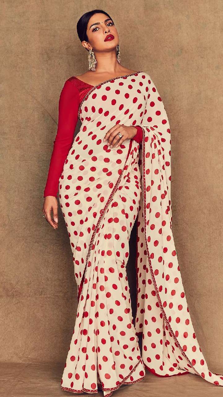 देसी गर्ल प्रियंका चोपड़ा साड़ी में तो कहर ढाती हैं। इस वैलेंटाइन पार्टी पर एक्ट्रेस का ये रेड एंड व्हाइट पोल्का प्रिंट साड़ी ट्राई कर सकती हैं। इसे पहनकर आप अपने पार्टनर की नींदे उड़ा सकती हैं।