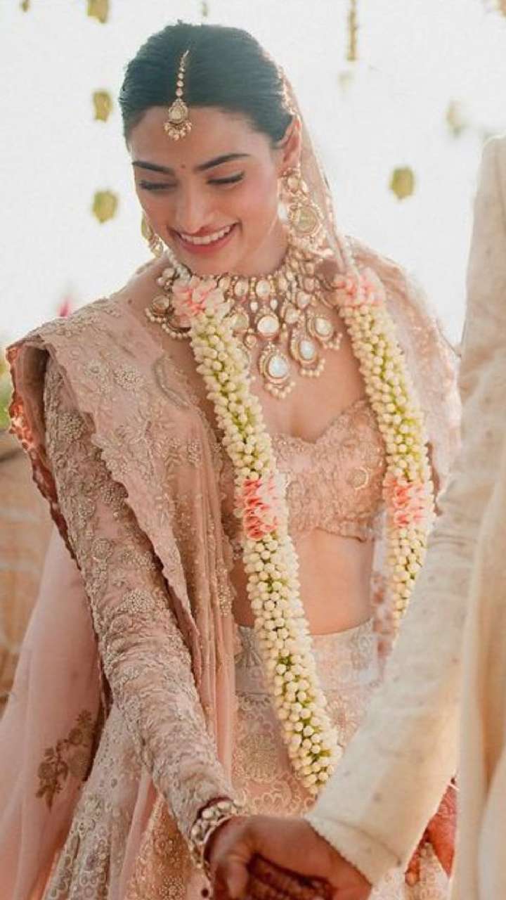 अथिया शेट्टी ने शादी के दिन लाइट पिंक कलर का लहंगा कैरी किया था। इस लहंगे को बनाने में 10 घंटों की मेहनत लगी थी।
