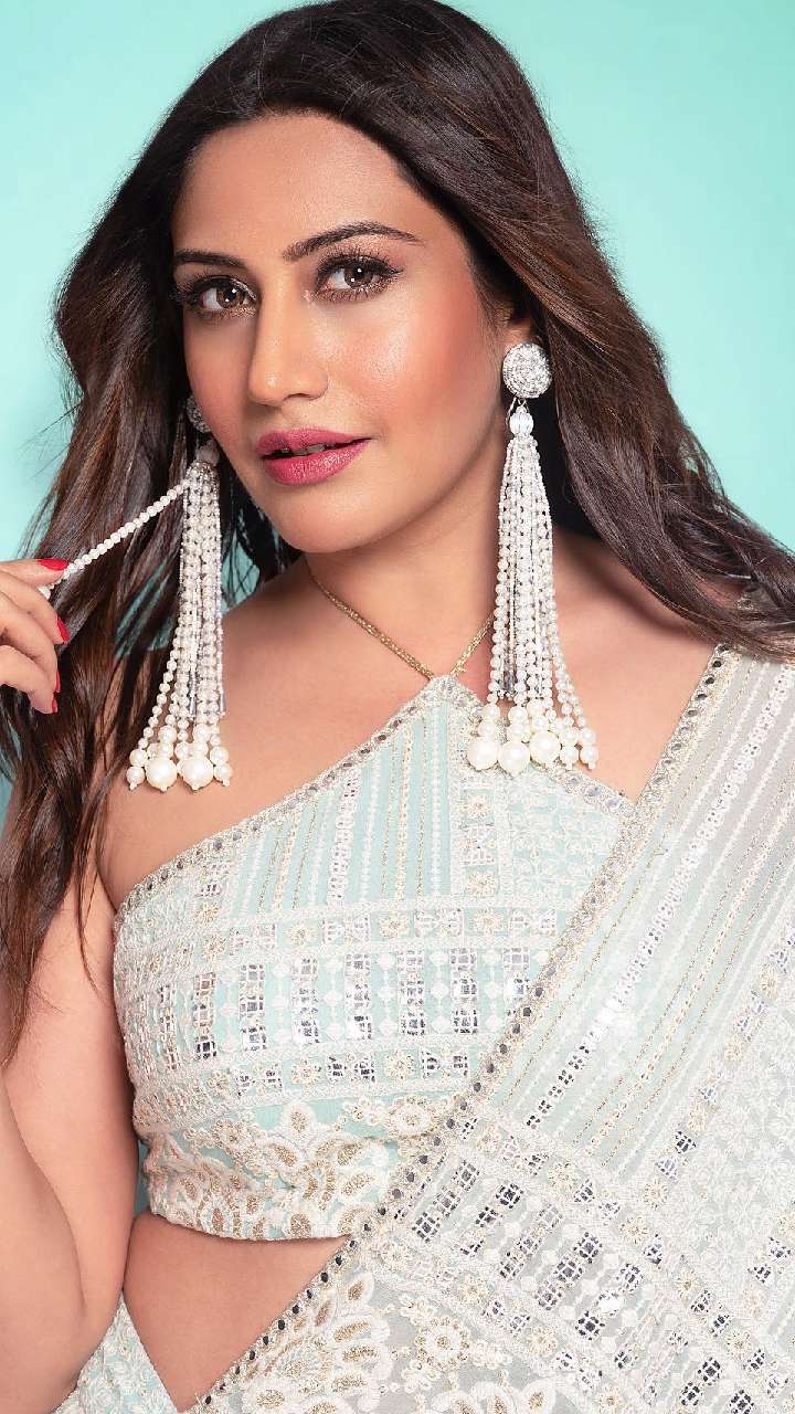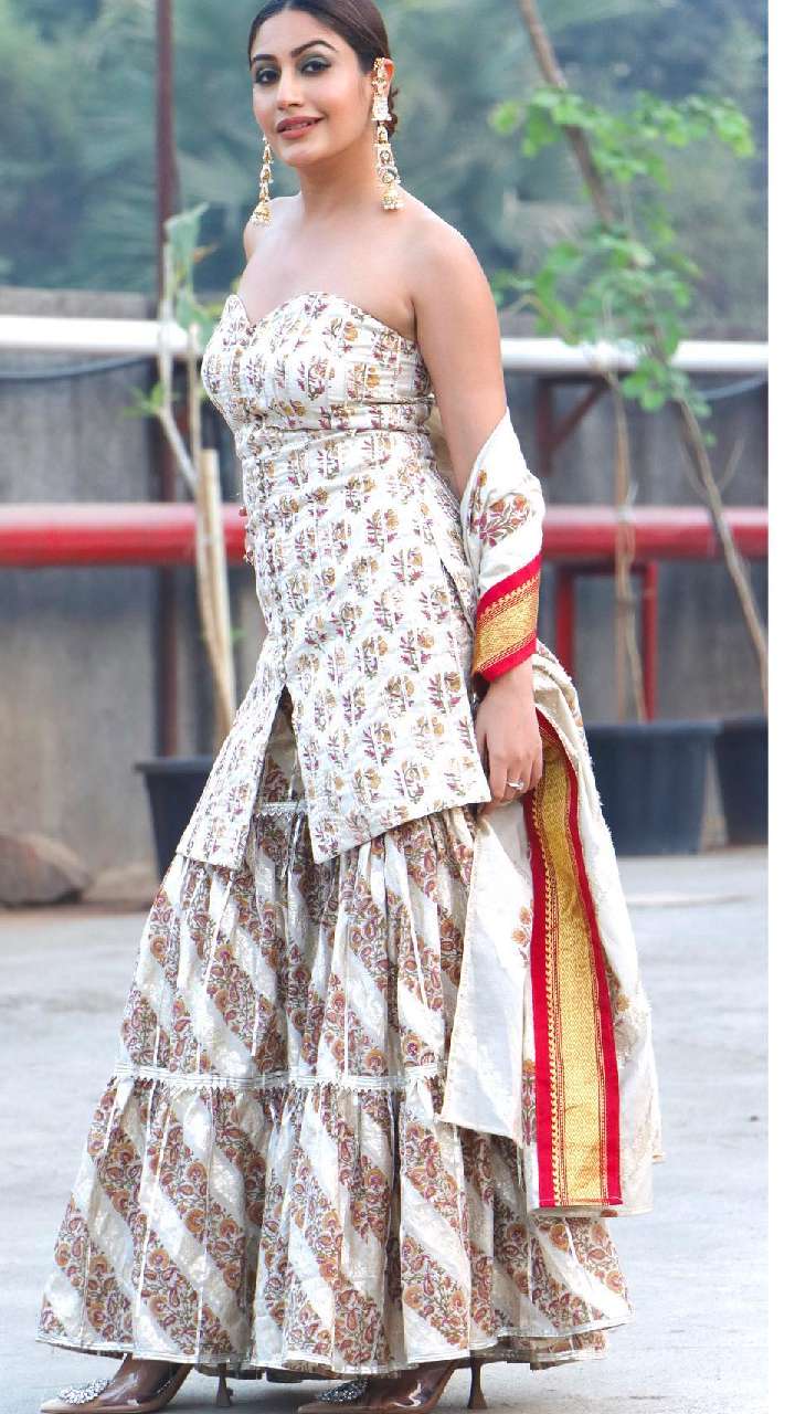 इस व्हाइट कलर के प्रिंटेड हेवी घेर शरारा सूट ऑफ शोल्डर कुर्ती में काफी खूबसूरत लग रही हैं। इसके साथ उन्होने लांग इयररिंग से अपना लुक कंप्लीट किया है।