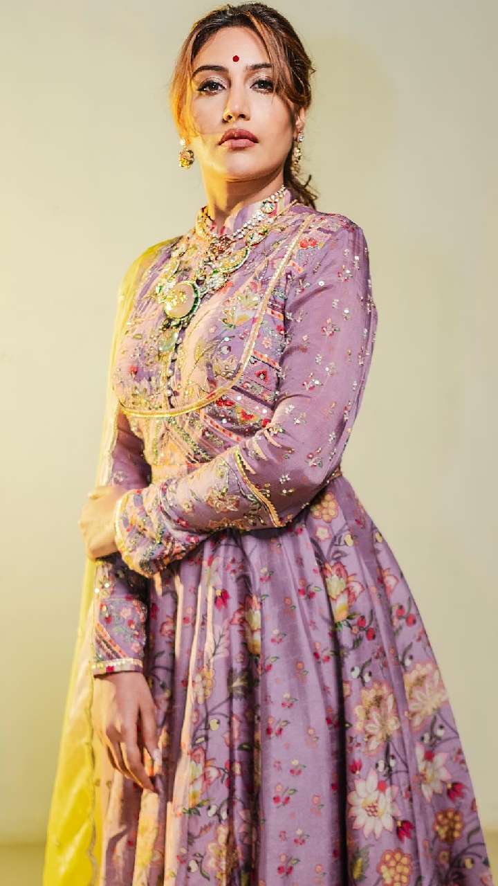 सुरभि इस पर्पल कलर के फ्लोरल प्रिंट अनारकली सिल्क सूट कुंदन नेकपीस पौनी हेयर स्टाइल में रॉयल लुक दे रही हैं।