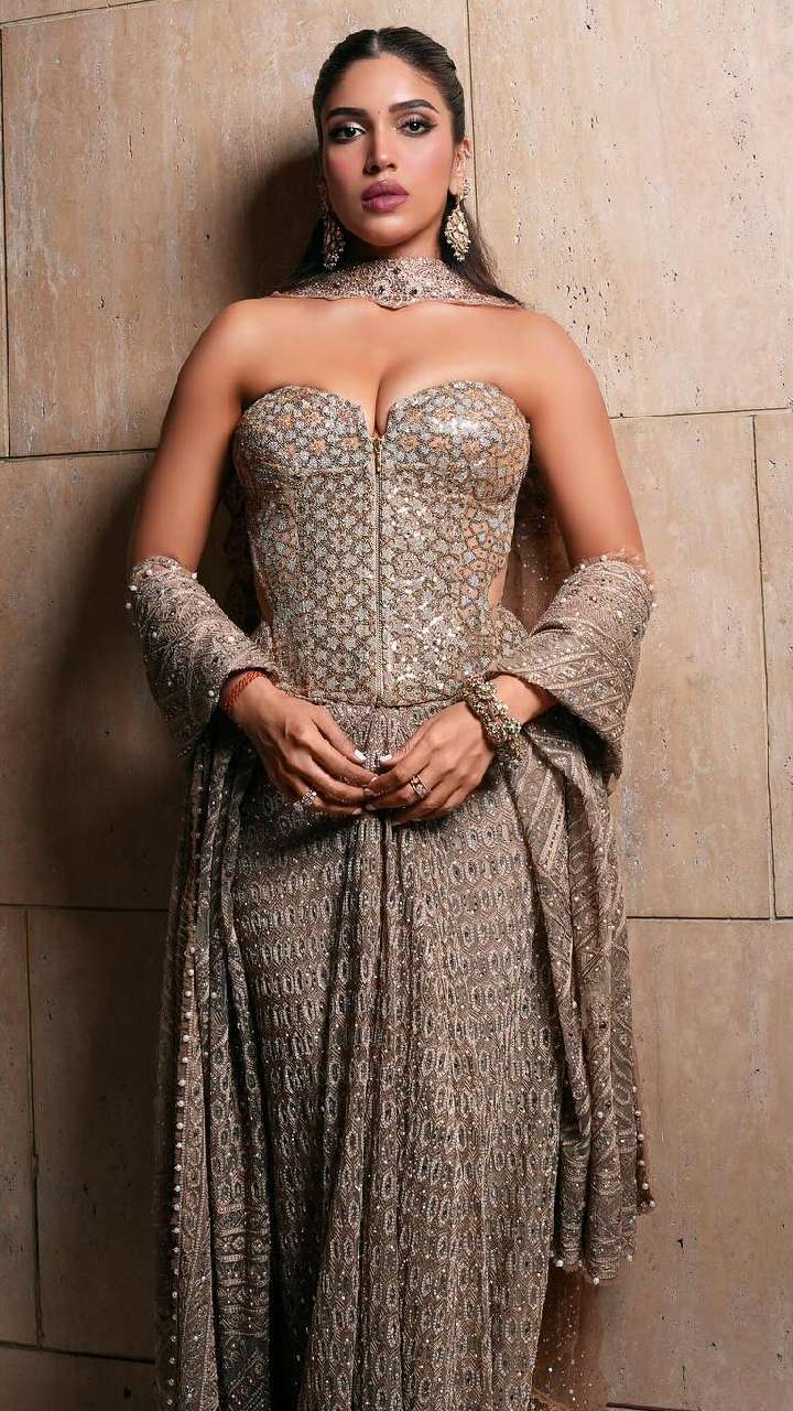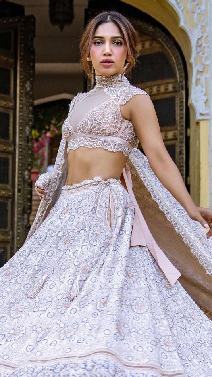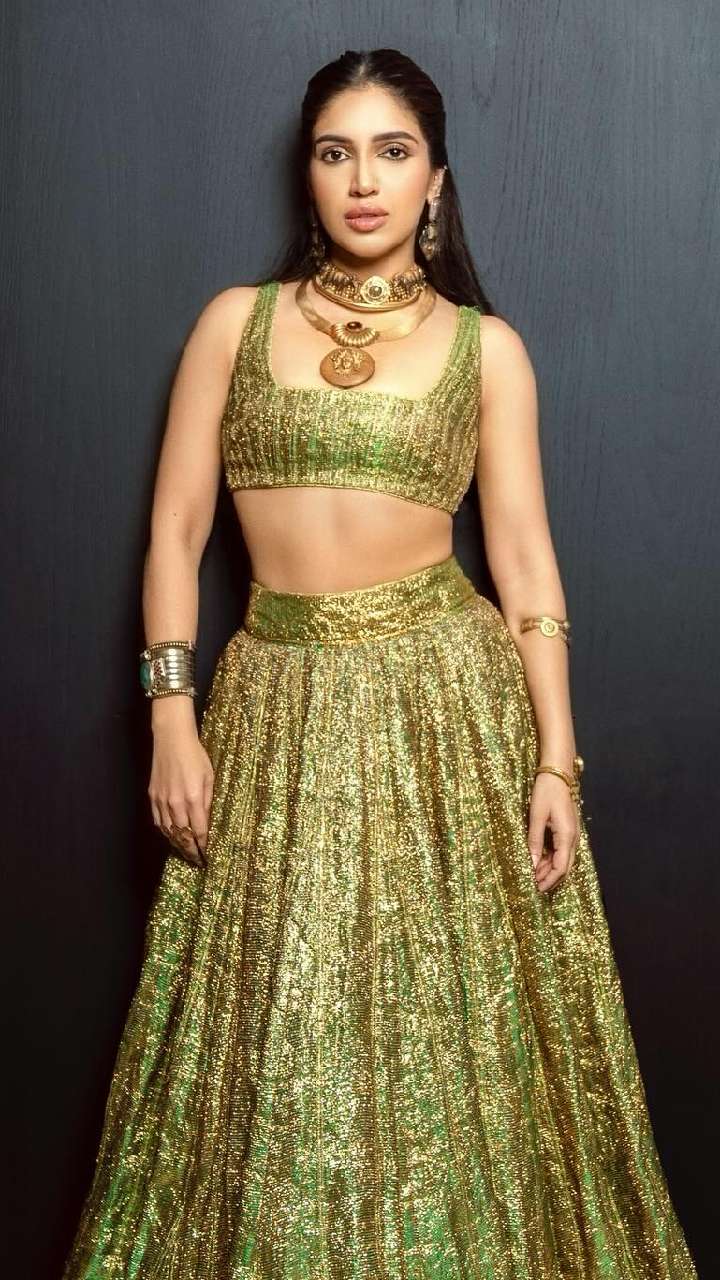 भूमि ने लहंगा के साथ वी नेकलाइन वाला ब्लाउज पहना है। इस तरह के ब्लाउज चौड़े कंधे वाली लड़कियों पर खूब जचती हैं।