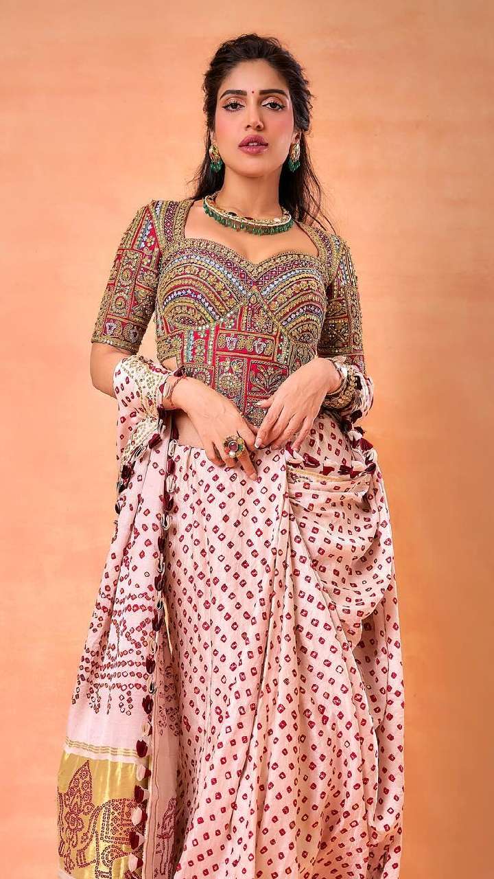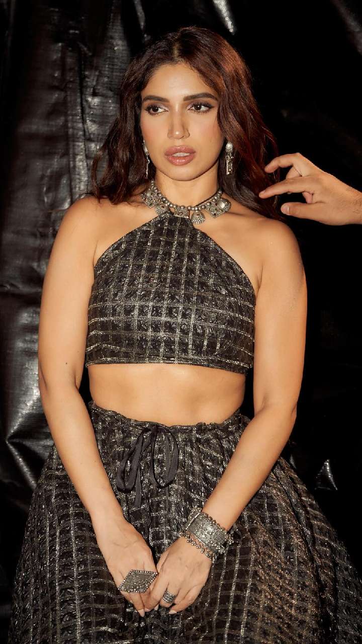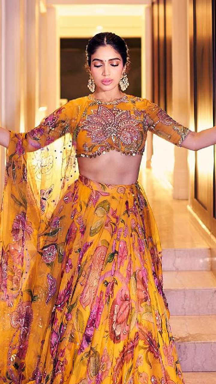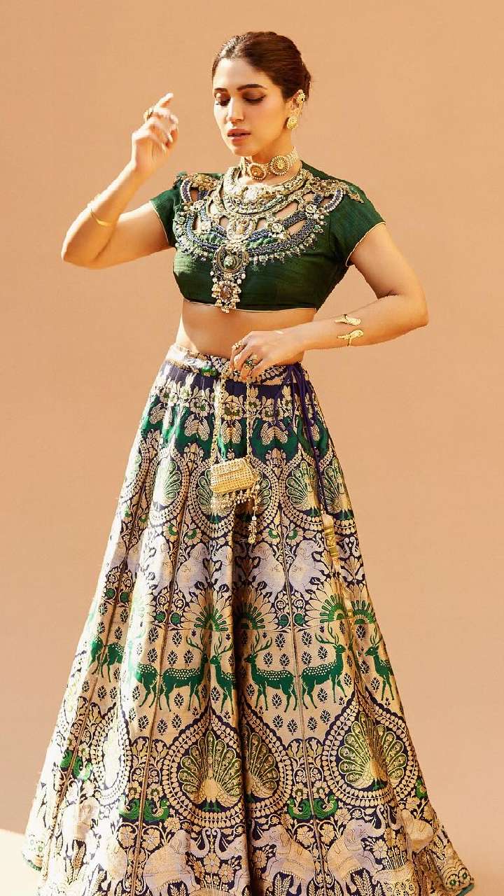 भूमि ने लहंगा के साथ वी नेकलाइन वाला ब्लाउज पहना है। इस तरह के ब्लाउज चौड़े कंधे वाली लड़कियों पर खूब जचती हैं।