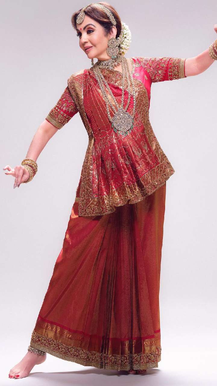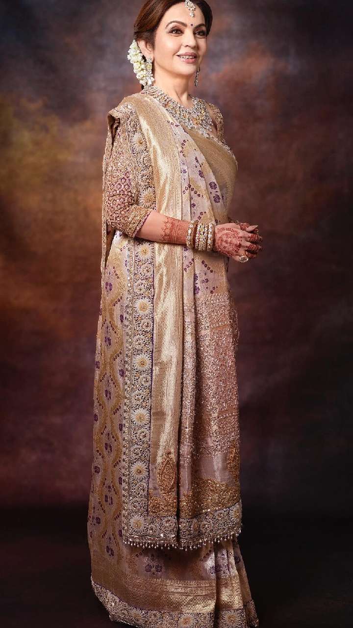 नीता अंबानी ने टिश्यू बनारसी साड़ी को सीधे पल्लू स्टाइल में पहनी है, जिसमें वह बहुत प्यारी लग रही हैं। ऐसी साड़ी को आप छठ पर्व के लिए चुन सकती हैं।