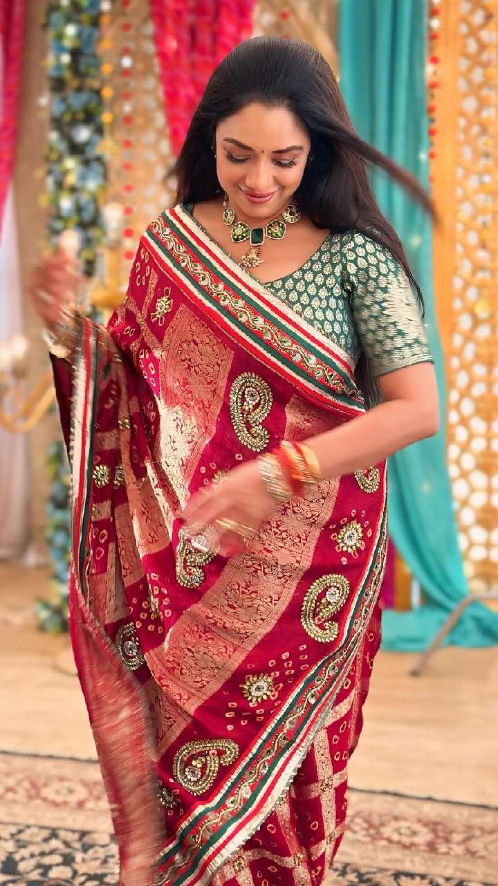 टीवी की अनुपमा रेड कलर की प्रिंटेड सीधे पल्लू साड़ी में बेहद खूबसूरत लग रही हैं। आप भी उनके इस लुक को छठ पूजा के लिए कॉपी कर सकती हैं।
