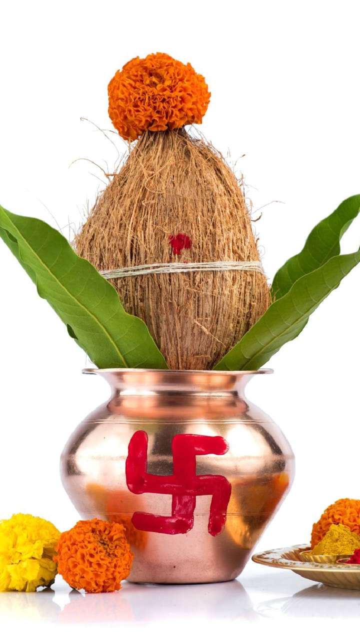 नवरात्र में घटस्थापना करते समय कलश में एक या दो रुपए का सिक्का डालना चाहिए। इसके साथ ही, आम के पत्ते और दूर्वा डालना भी शुभ होता है।