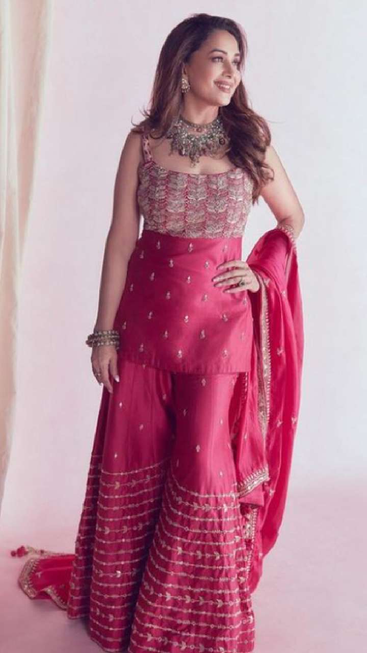 माधुरी दीक्षित का हर लुक काफी ज्यादा स्टाइलिश होता है। आप भी माधुरी की तरह ही पिंक शरारा कैरी कर सकती हैं।