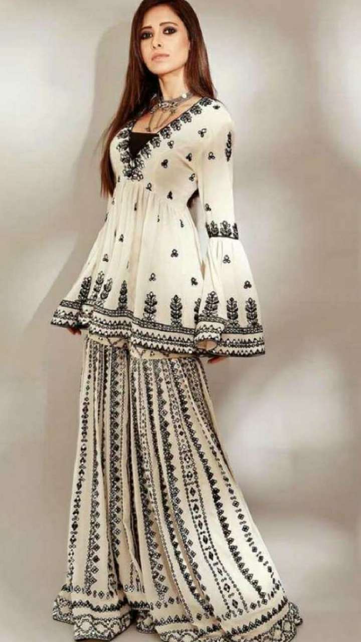 नुसरत भरुचा का ये ब्लैक एंड व्हाइट शरारा सूट आपको ट्रेंडी लुक देगा। एक्ट्रेस से आप फैशन और स्टाइलिंग टिप्स ले सकती हैं।