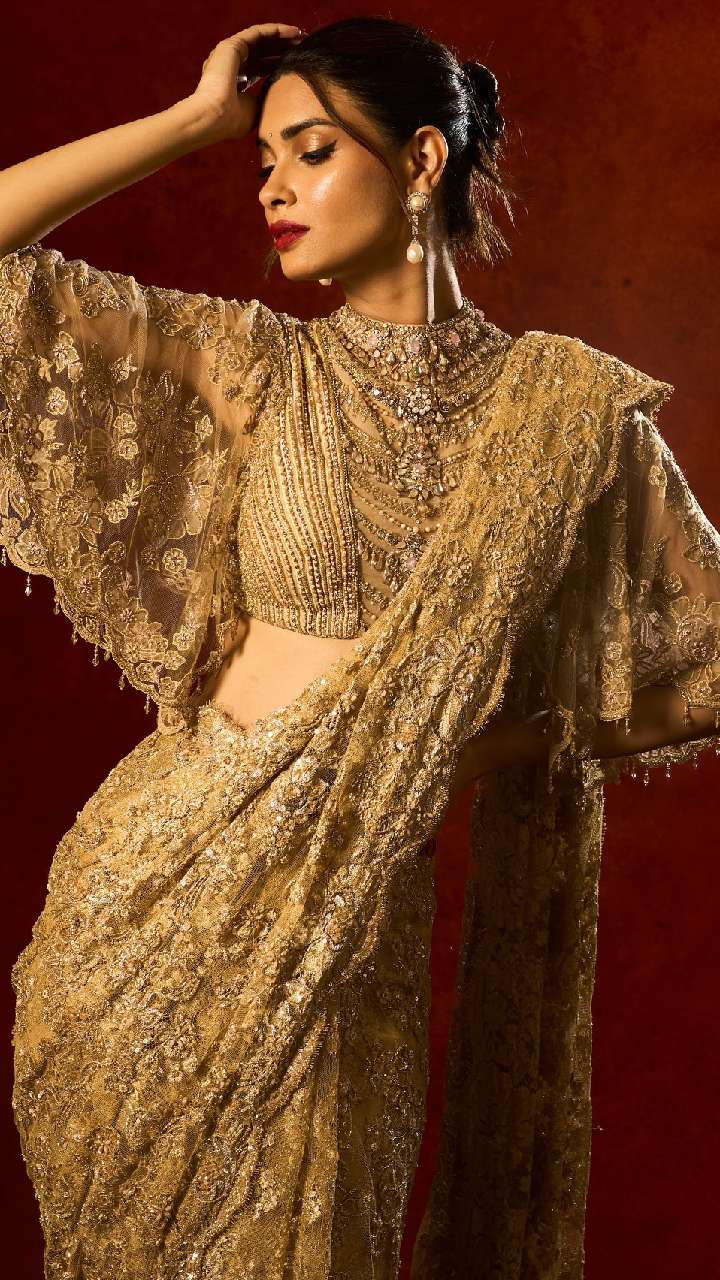 Diana Penty ने गोल्डन साड़ी को हाई नेक ब्लाउज के साथ पहनकर लुक को मॉडर्न ट्विस्ट दिया है। यह शिमरी साड़ी यंग और पतली लड़कियों पर काफी सुंदर लगेगी। इस साड़ी को पहनकर आप कोई भी फंक्शन अटेंड कर सकती हैं।