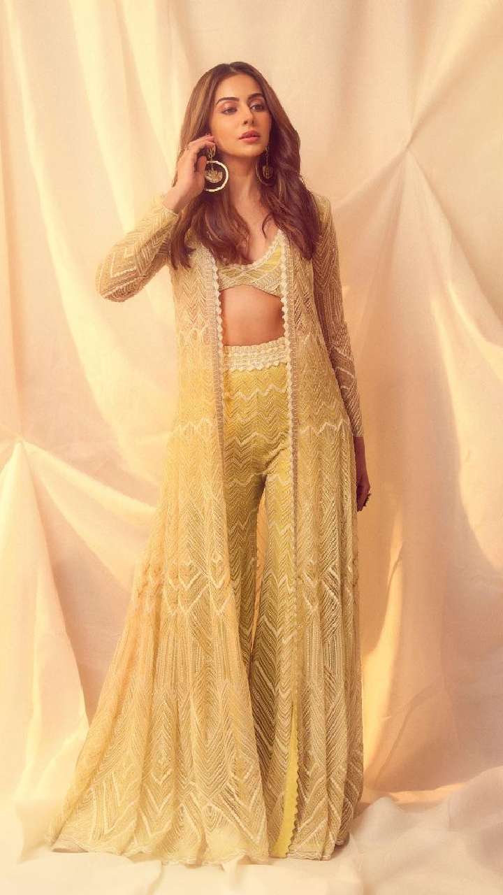 बॉलीवुड एक्ट्रेस रकुल प्रीत सिंह येलो इंडो वेस्टर्न आउटफिट में बेहद ही ग्लैमरस दिख रही हैं।