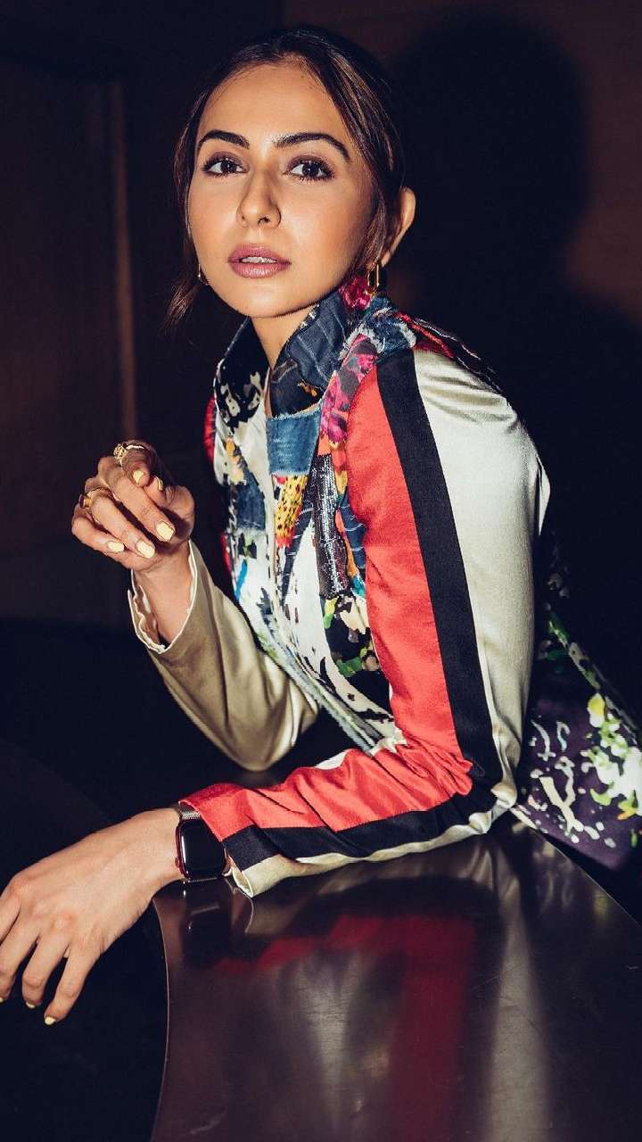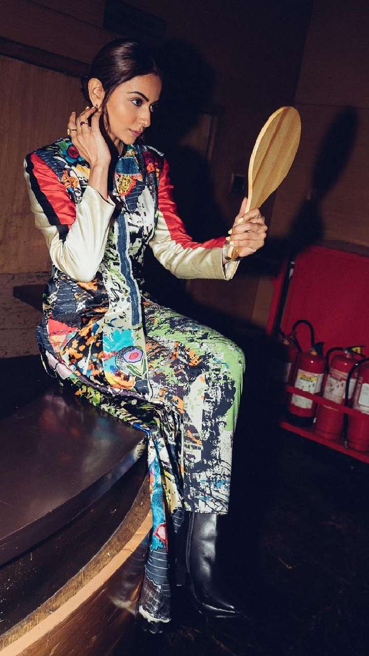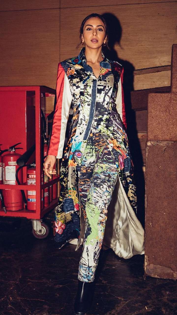 रकुल अपनी इस तस्वीर में कलरफुल ड्रेस पहने बेहद स्टाइलिश और प्रिटी लग रही हैं।