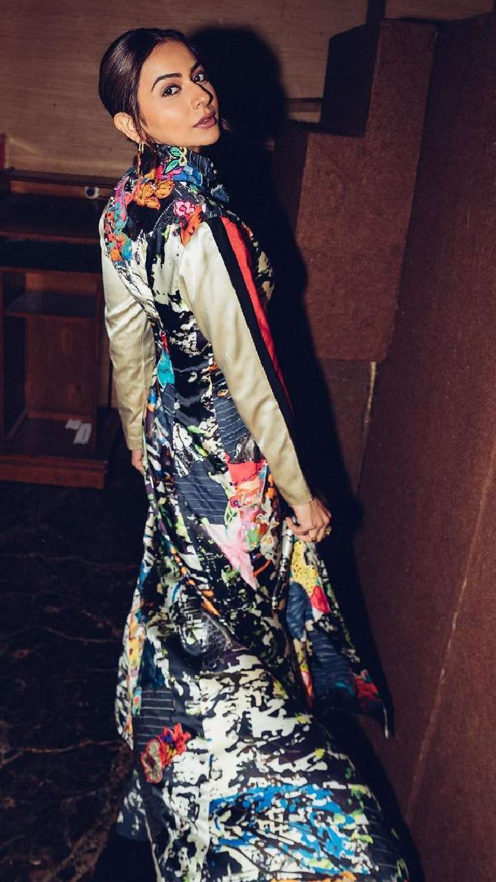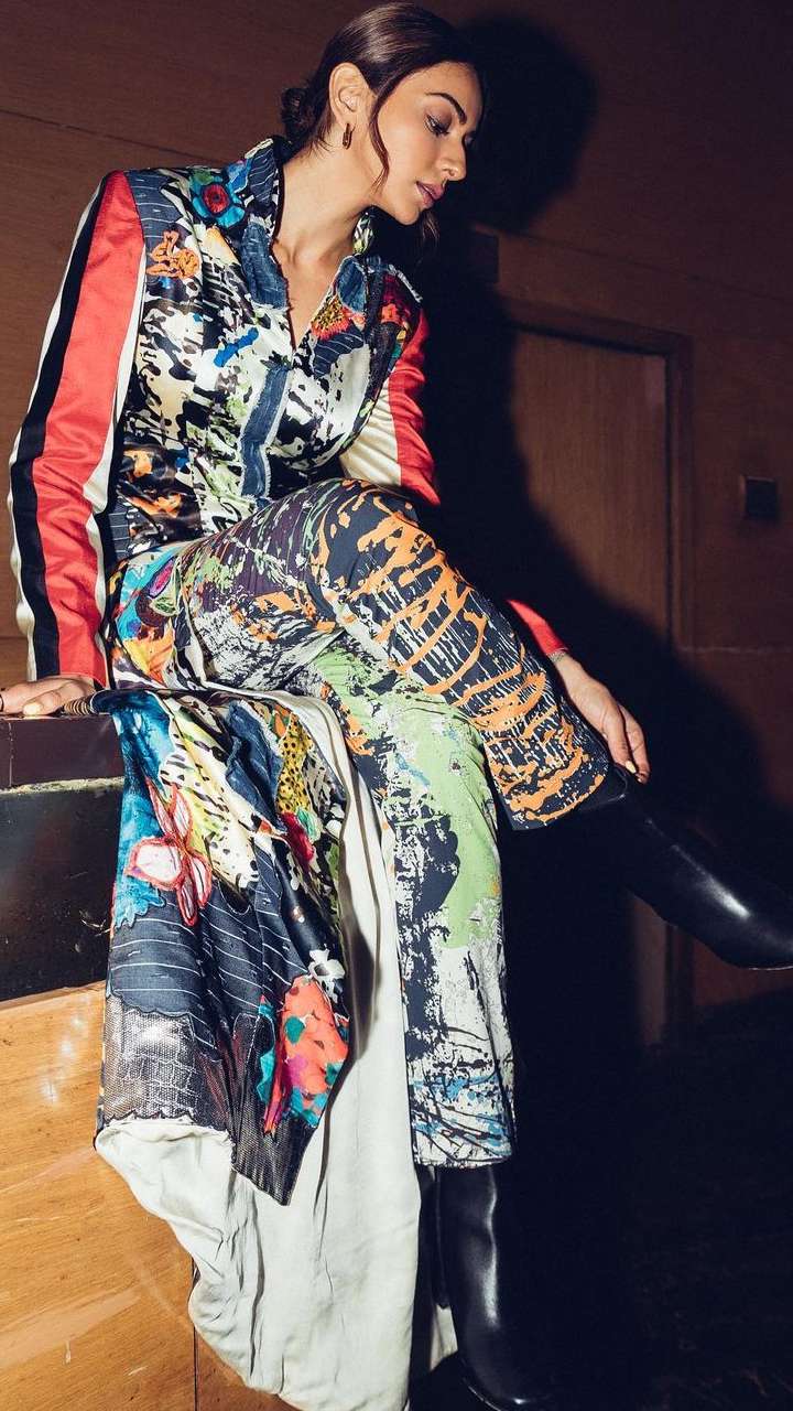 एक्ट्रेस ने तस्वीर में मल्टी कलर लॉन्ग शर्ट, पैंट और ब्लैक शूज पहना हुआ है।